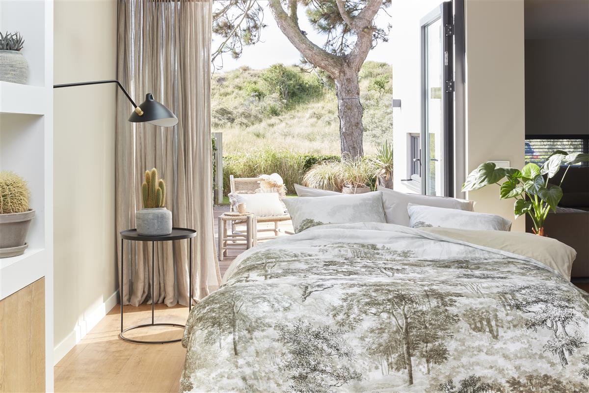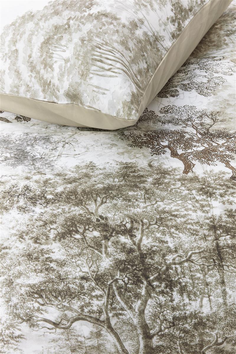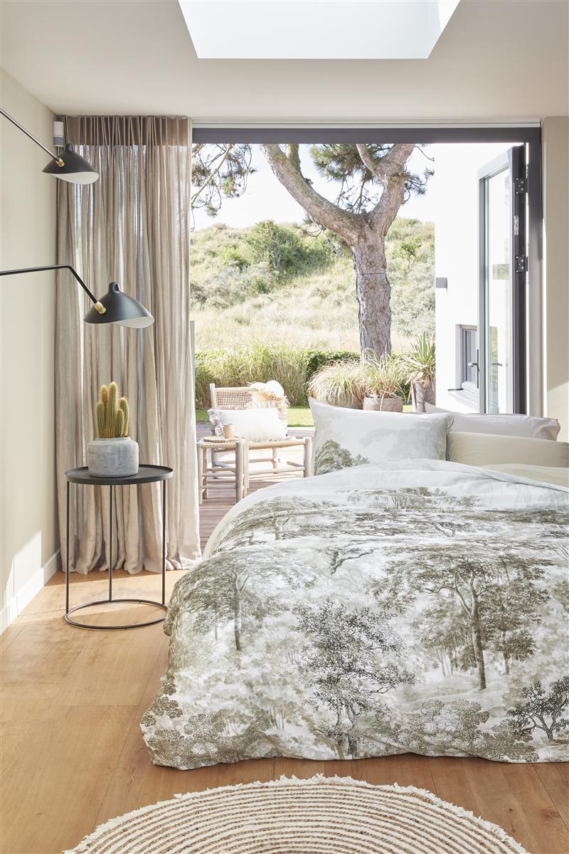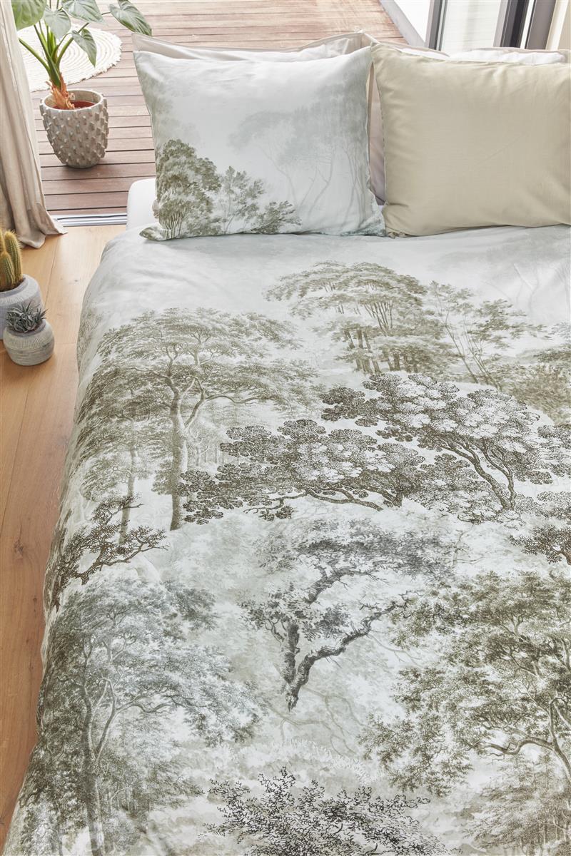 Op dekbedovertrek Arcadia is een idyllisch landschap afgebeeld van beboste heuvels. De bomen zijn met de hand geschilderd en getekend in natureltinten. De achterzijde heeft een effen zand kleur. Het overtrek heeft een chique glans door de satijnweving. Het overtrek is beschikbaar in meerdere kleuren.