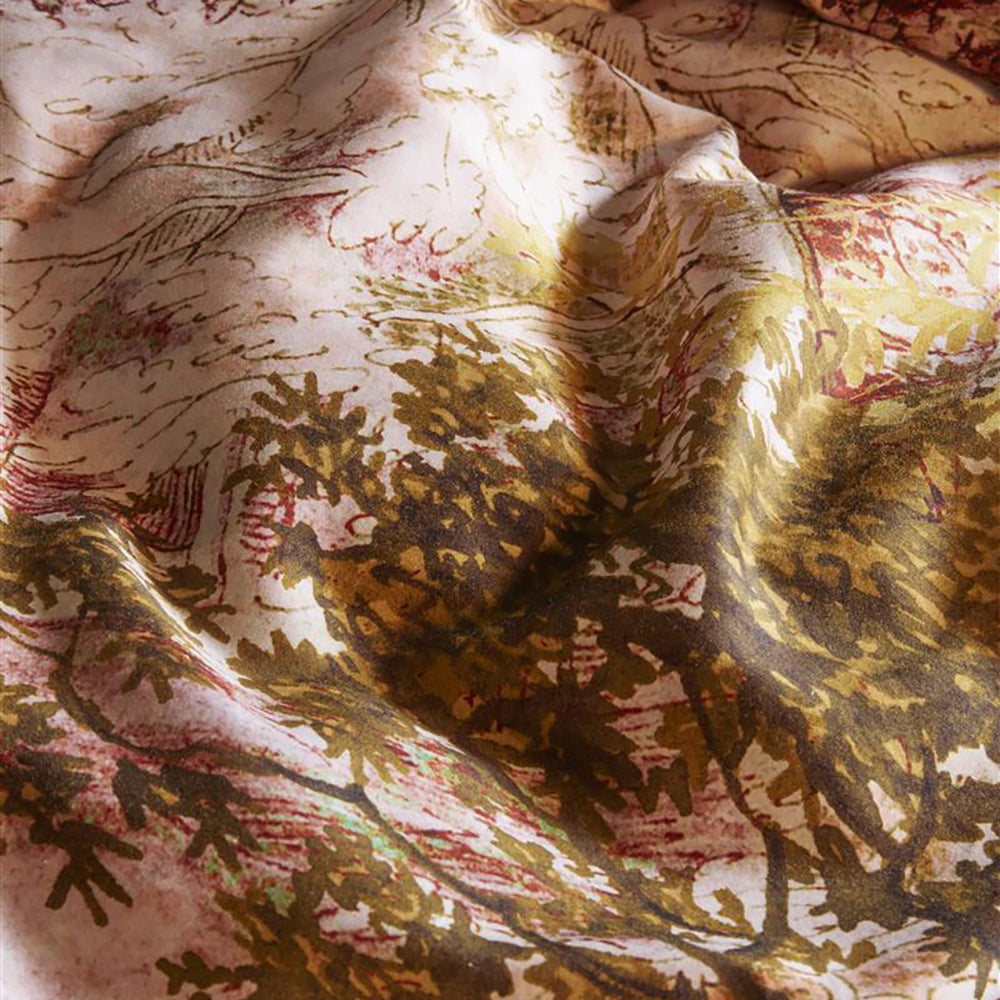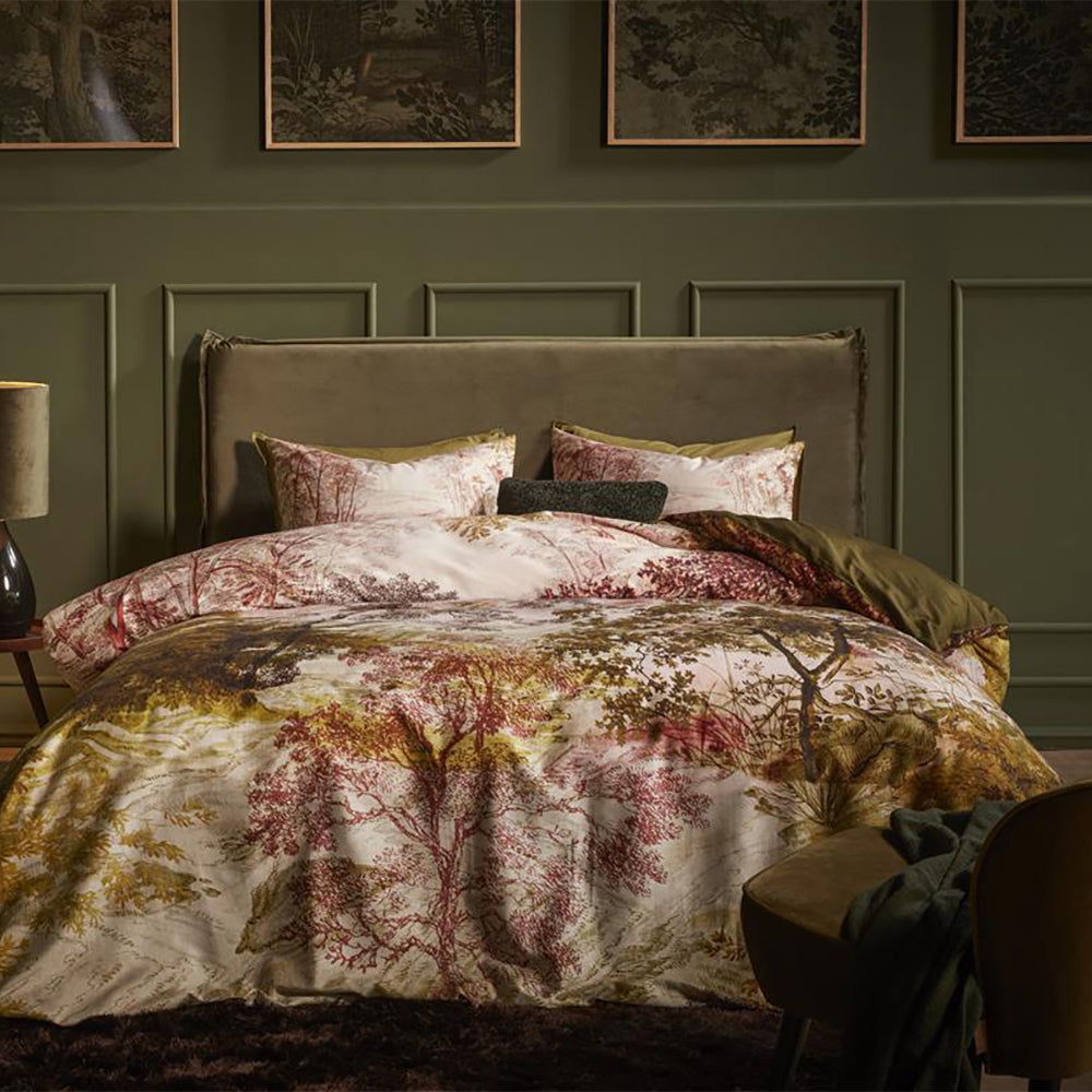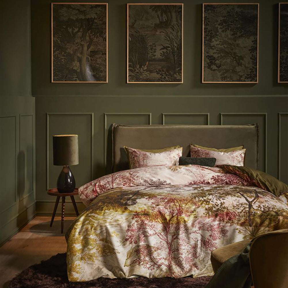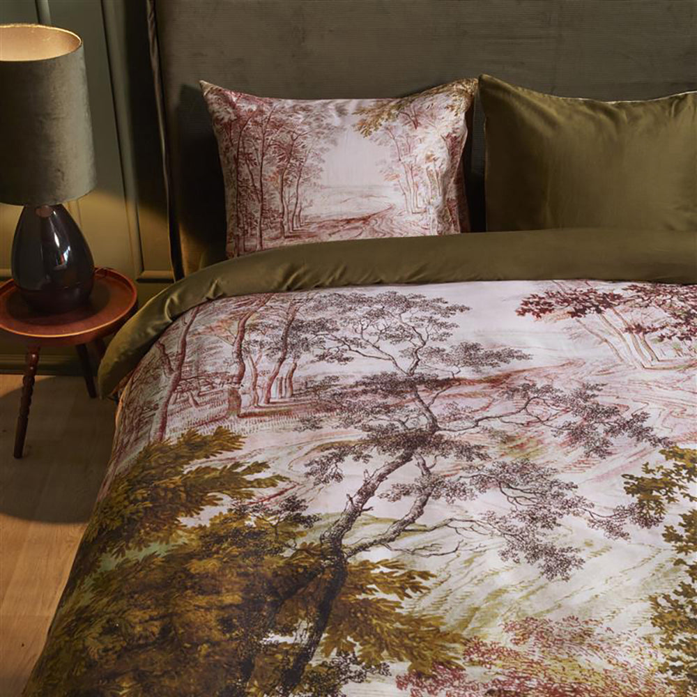 Breng de natuur in huis met dekbedovertrek Odile van Beddinghouse. Op het overtrek is een boomlandschap te zien. Het landschap is opgebouwd uit vintage pintekeningen in herfstachtige tinten. De achterzijde van het overtrek heeft een effen olijfgroene kleur. Het dekbedovertrek heeft een chique glans door de satijnweving.