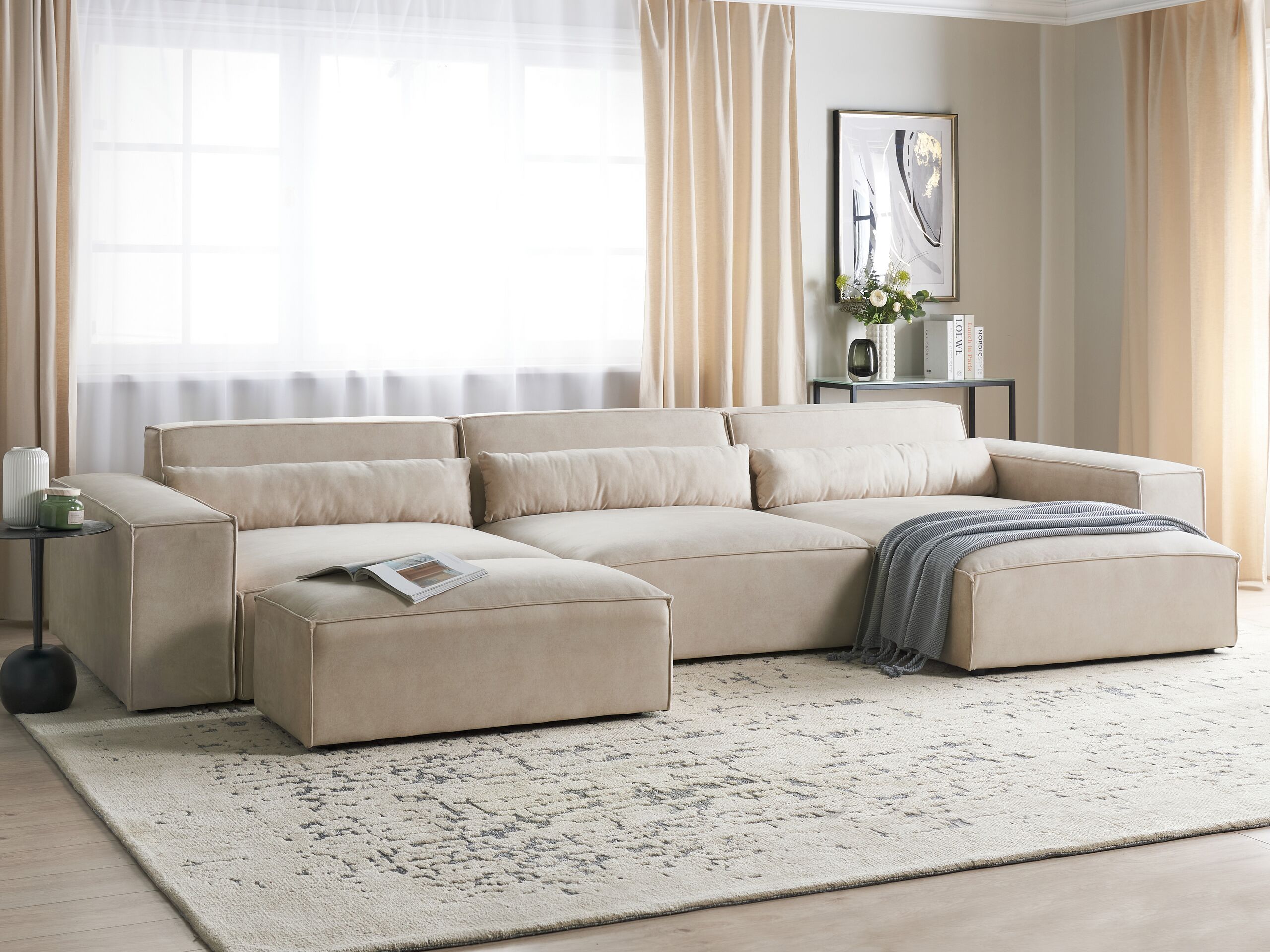 Beliani-HELLNAR-Hoekbank 3-zits met ottomaan-Beige-Links-Fluweel
