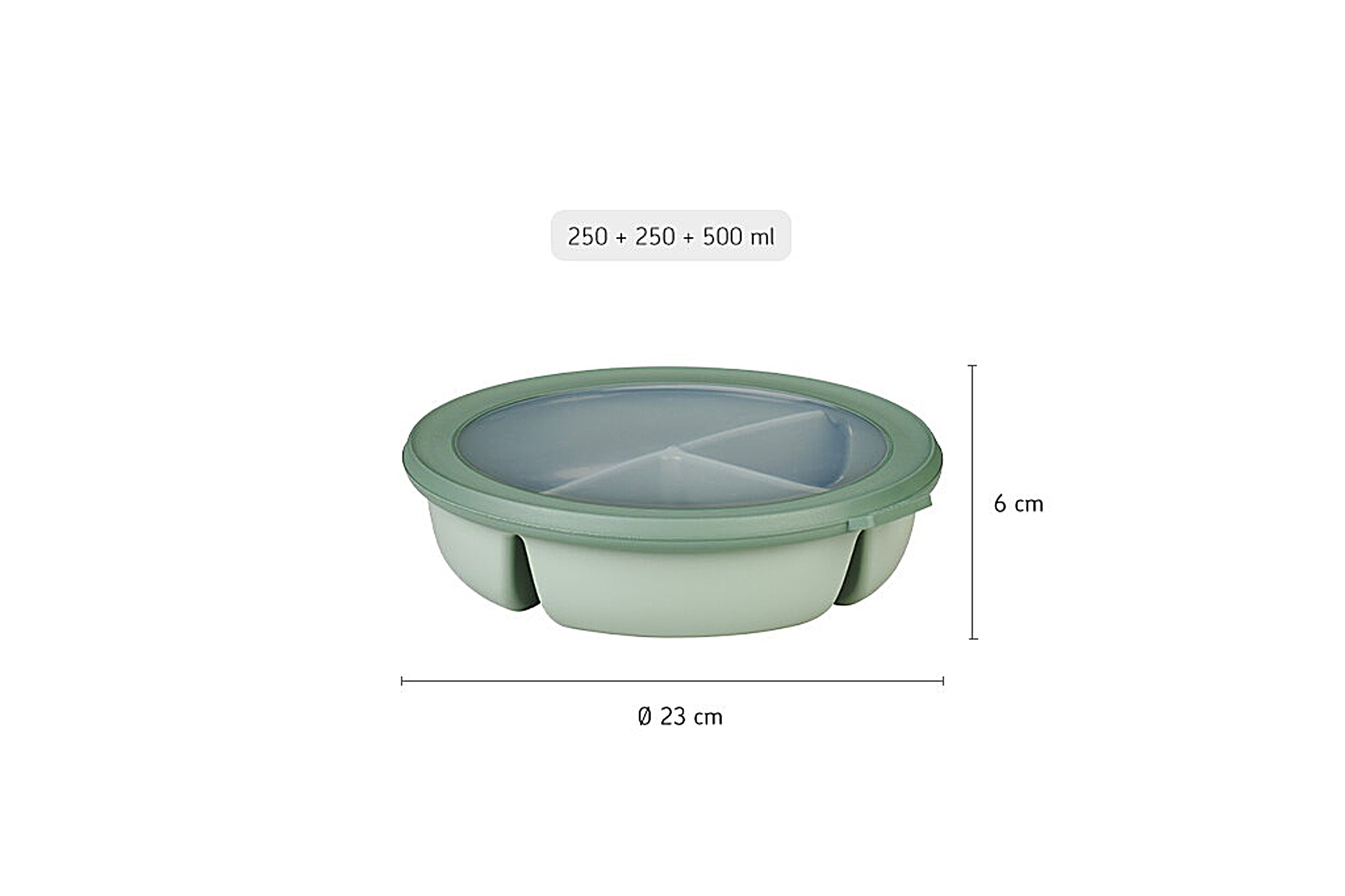 De bento bowl met drie vakken en een inhoud van 250 + 250 + 500 ml is ideaal om de verschillende ingrediënten van een maaltijd apart van elkaar te bewaren. De groene multikom heeft drie vakken, waarin de hoofdingrediënten van een typisch Hollands gerecht, zoals aardappelen, groenten en vlees, maar ook een Indische curry met rijst en groenten en saus gescheiden blijven. Deze schaal is perfect voor het bewaren en serveren van groente snacks met een dip of gebruikt worden als pokebowl. De bento bowl Cirqula is de ideale meal prepper. De voorbereide gerechten kunnen in de bowl met drie vakken direct uit de koelkast of vriezer (zonder deksel) in de magnetron opgewarmd worden. De bowl kan na gebruik in de vaatwasser gereinigd worden. De magnetronbestendige schaal is gemaakt van sterk materiaal en heeft een transparante deksel, zodat je altijd kunt zien wat er in de schaal zit. Met de deksel sluit je de schalen met drie vakken wordt lekdicht, lucht- en aromadicht af, waardoor de gerechten lekker lang vers blijven. Je neemt ze gemakkelijk mee voor onderweg. Extra tip: gebruik de bento bowl ook voor een gezellig hapje en drankje met vrienden of tijdens een picknick als snackschaal, gevuld met chips, dips en andere lekkernijen.