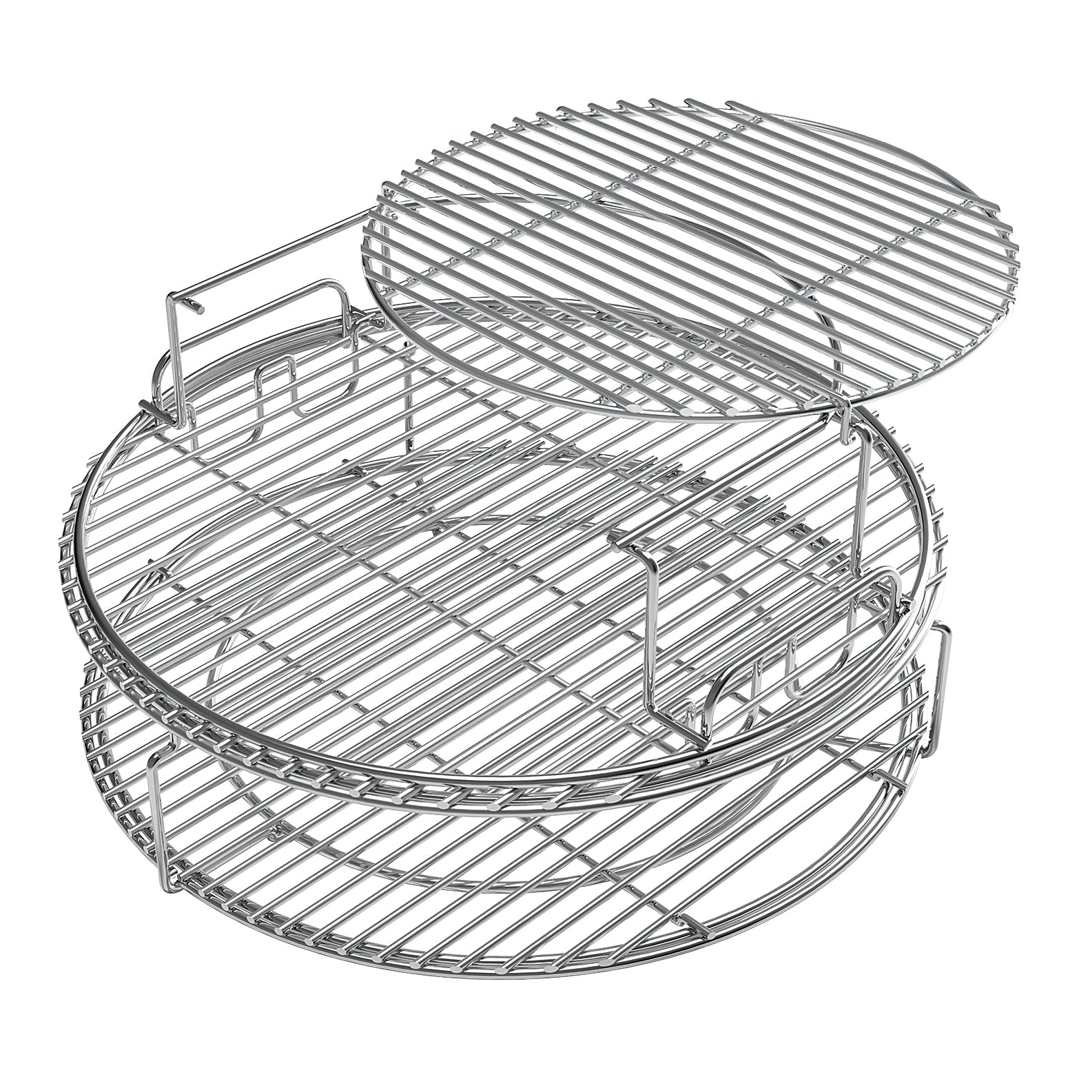 - 2 halfronde RVS roosters: Gebruik ze allebei tegelijk als een volledig rooster of plaats er slecht één, zodat je ernaast ruimte hebt voor andere kooktechnieken.