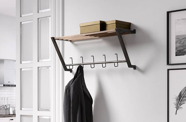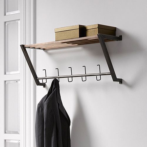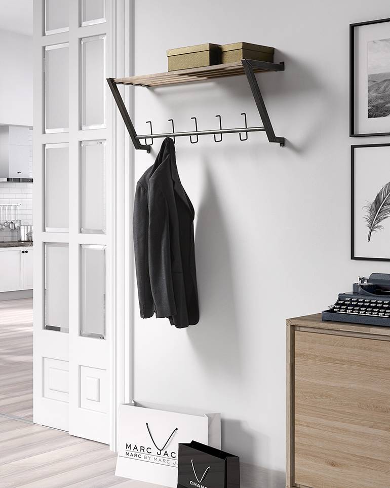 Industriële kapstok met 5 haken, de hoedenplank is gemaakt van hout. Breedte: 89 cm, hoogte: 34 cm, de kapstok komt 28 cm van de muur af. Dit is een 'bouwpakket' en krasjes zijn bij dit produkt niet uit te sluiten, excl. kleding hangers.