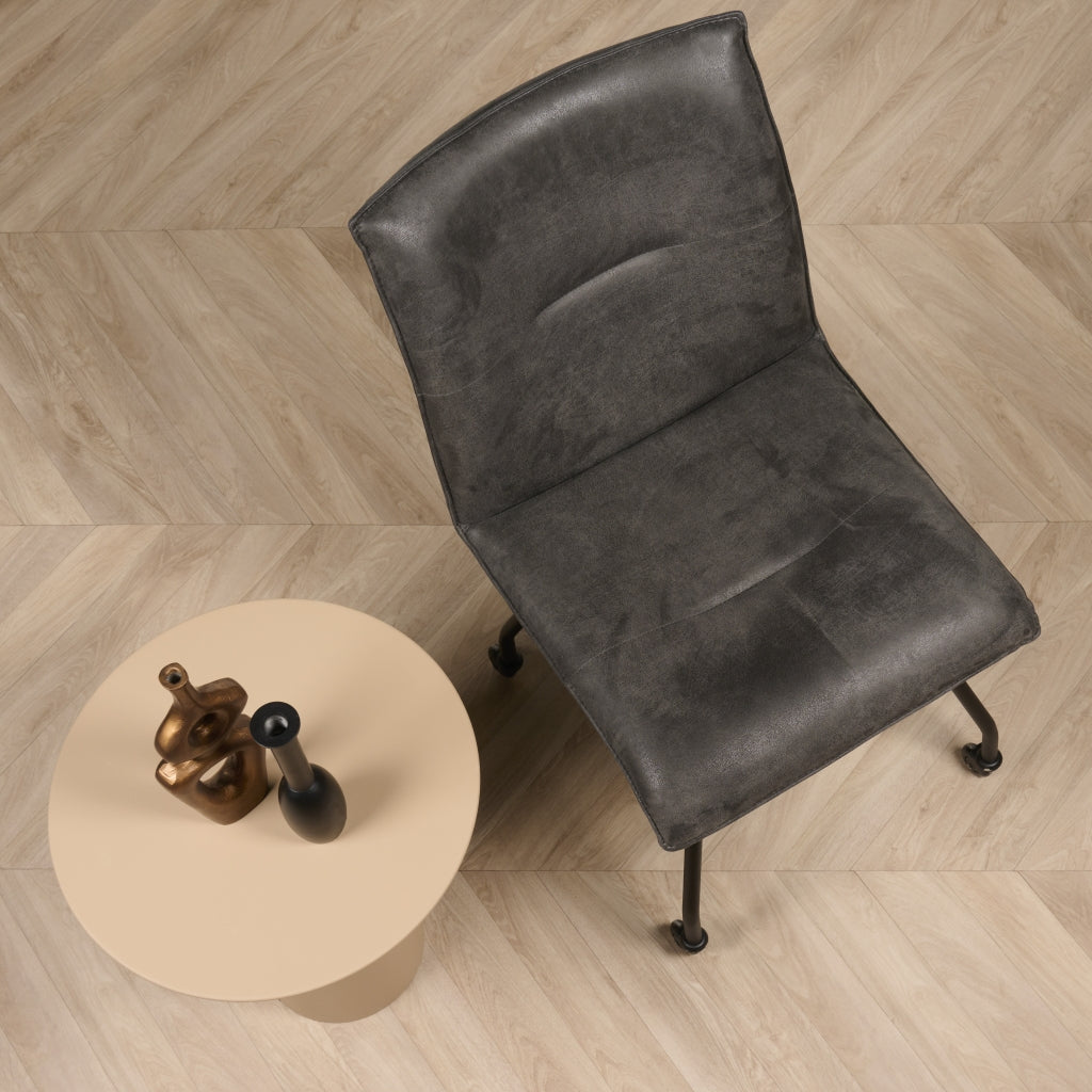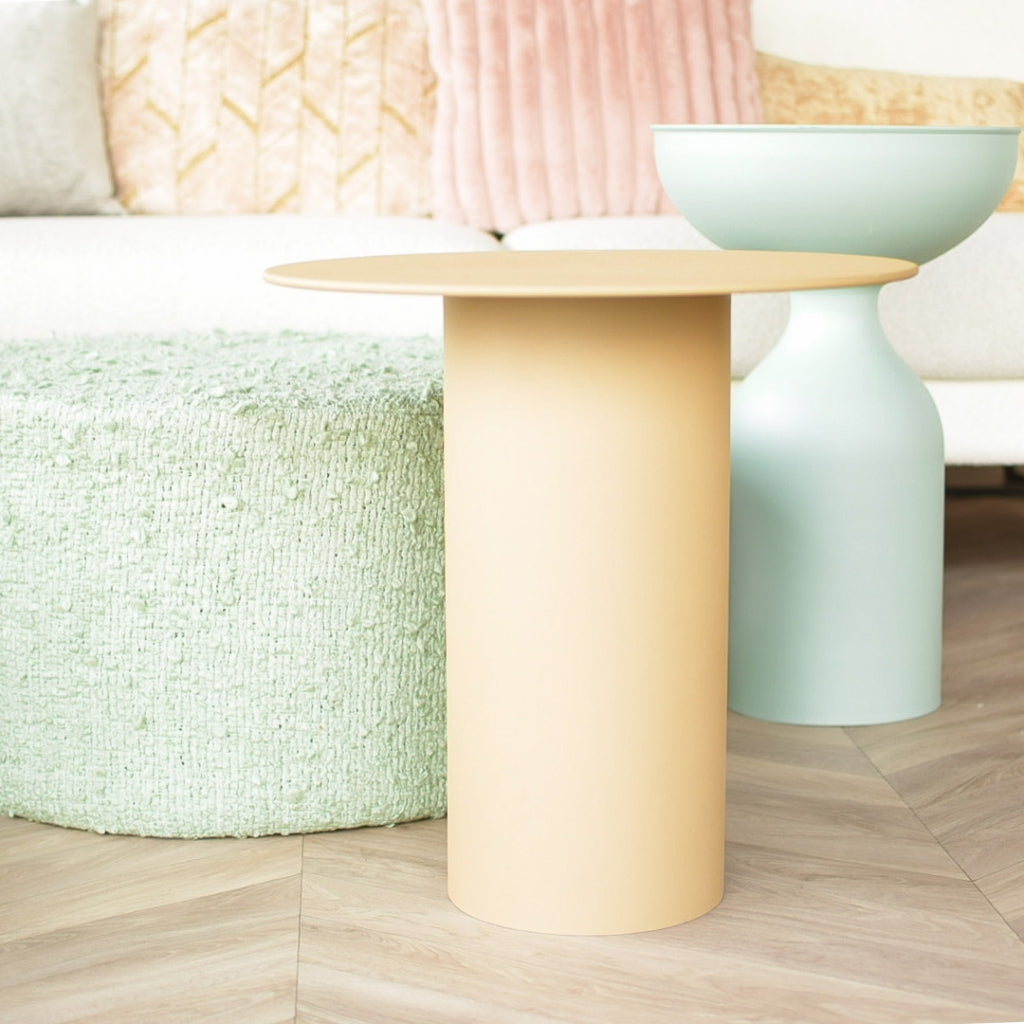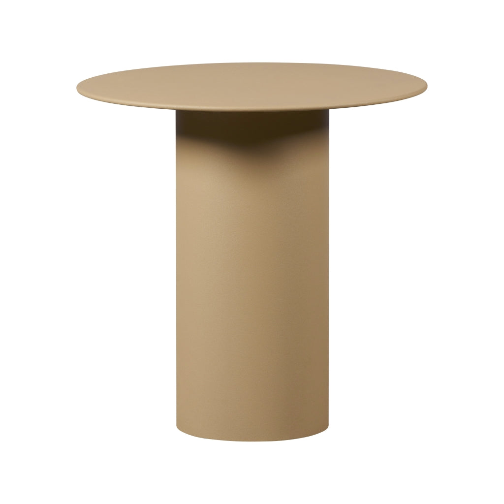 Bijzettafel Rorra heeft een diameter van 33 cm en is 50 cm hoog. De tafel is geheel van metaal in een zachte skin kleur. Het matte metaal heeft een geruwde structuur.