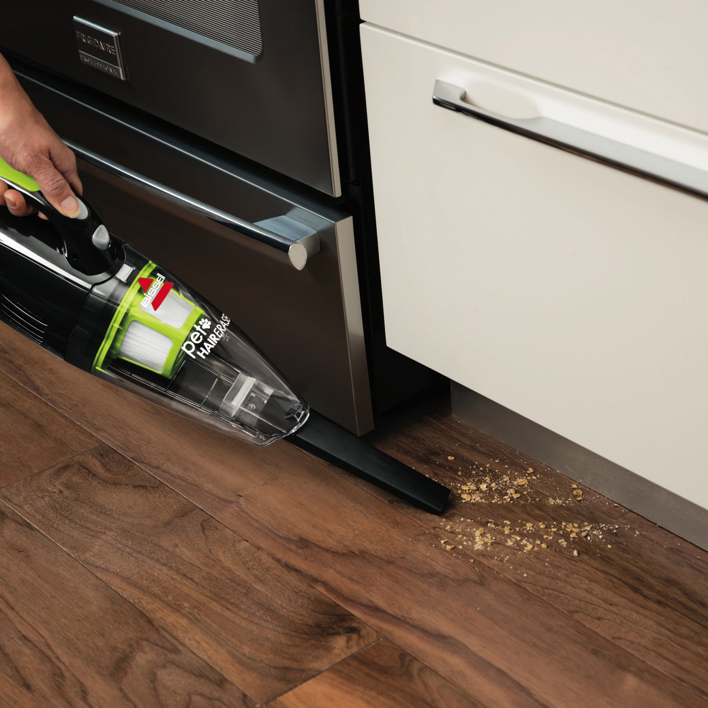 Met de BISSELL Pet Hair Eraser kruimelzuiger verwijder je eenvoudig huisdierharen van je meubilair, tapijt of uit je auto. De kruimelzuiger is draadloos en licht van gewicht waardoor hij erg makkelijk in gebruik is. Het opgezogen vuil wordt gefilterd door een dubbel filtratie systeem, voordat het in de filter terecht komt. Je reinigt het filter hierdoor en verlengt daarmee de levensduur. Bij deze BISSELL Pet Hair Eraser kruimelzuiger krijg je verschillende opzetstukken bijgeleverd: een meubelborstel, een kierenzuigmond en een speciale borstel tegen huisdierharen. De vuilcontainer leeg je na gebruik zo in de prullenbak.