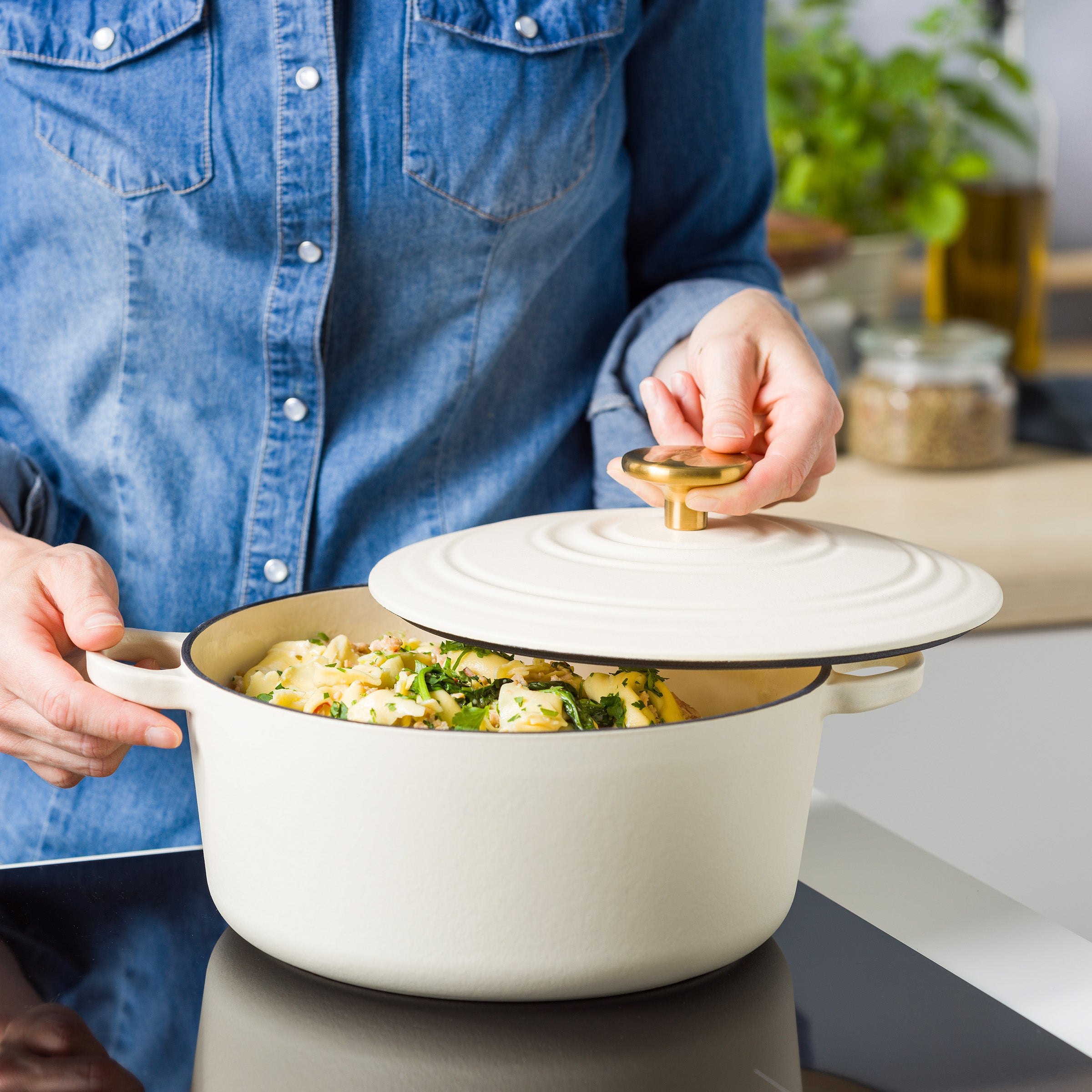 - De ambachtelijke pan is gemaakt van geëmailleerd gietijzer