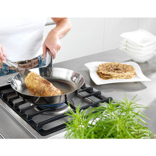 Doordat de pan uit drie lagen bestaat is deze vrij zwaar. Dit is extra fijn wanneer de pan stevig op het fornuis moet staan, wanneer je erin wilt mixen, roeren of pureren. De pannen zijn geschikt voor alle warmtebronnen inclusief inductie en de oven.