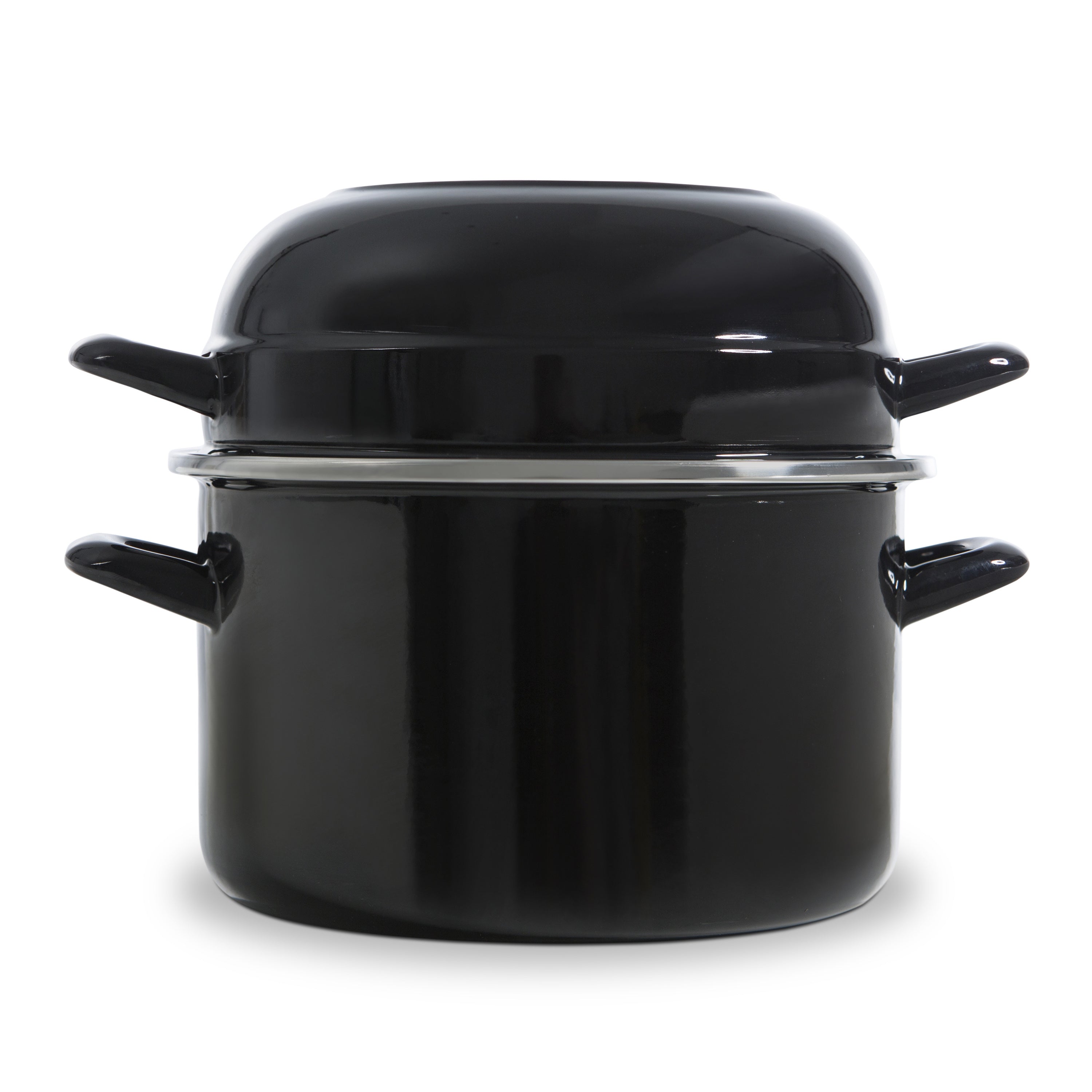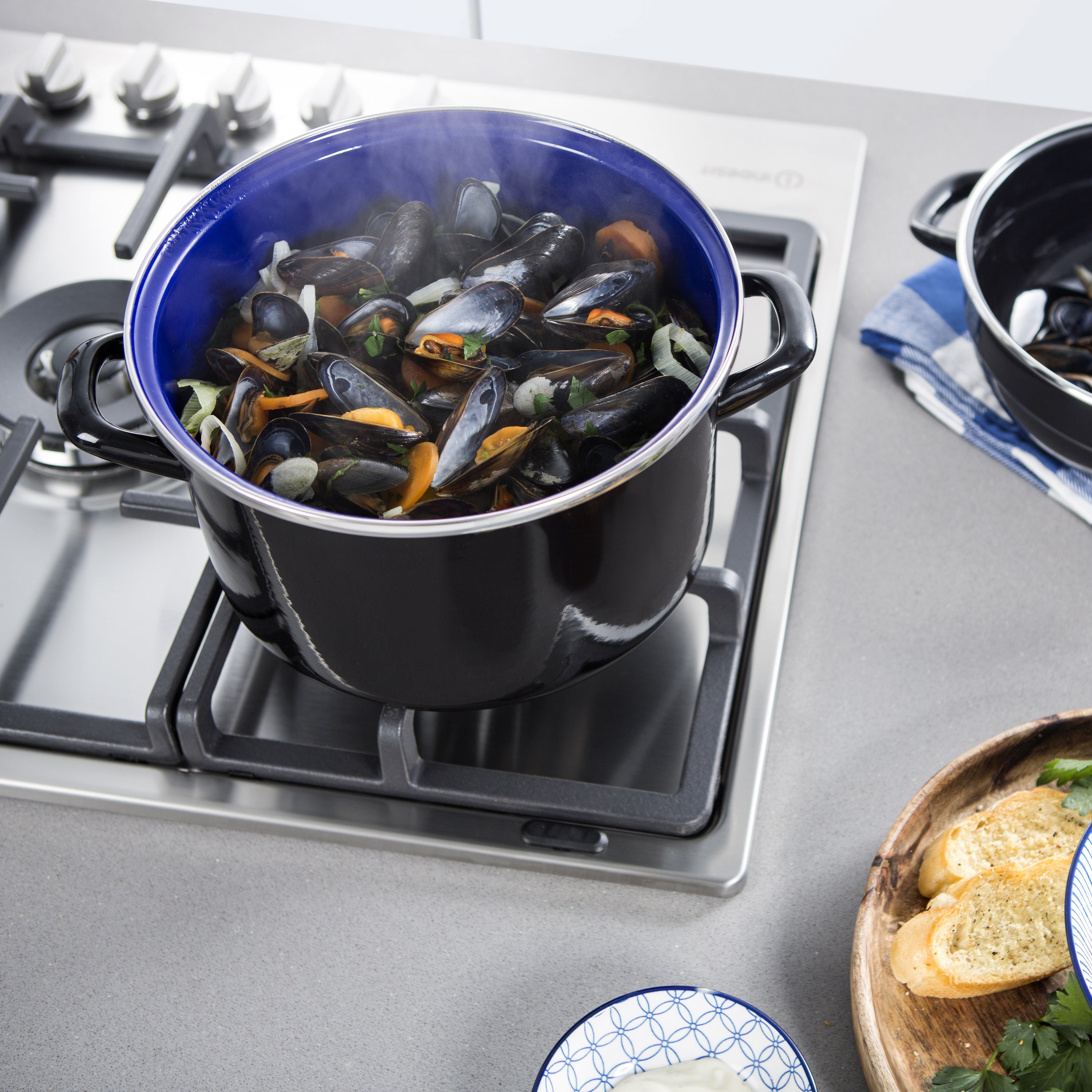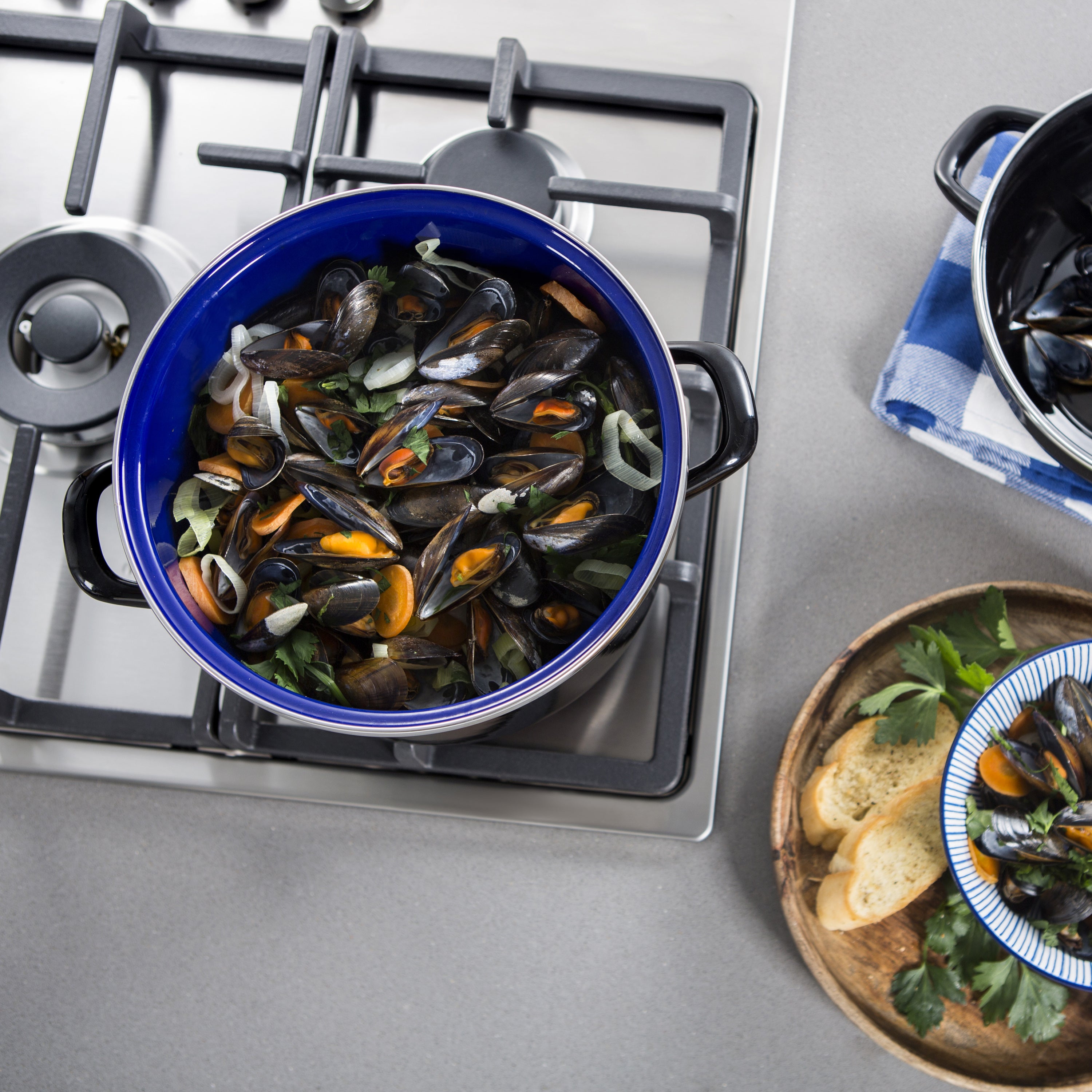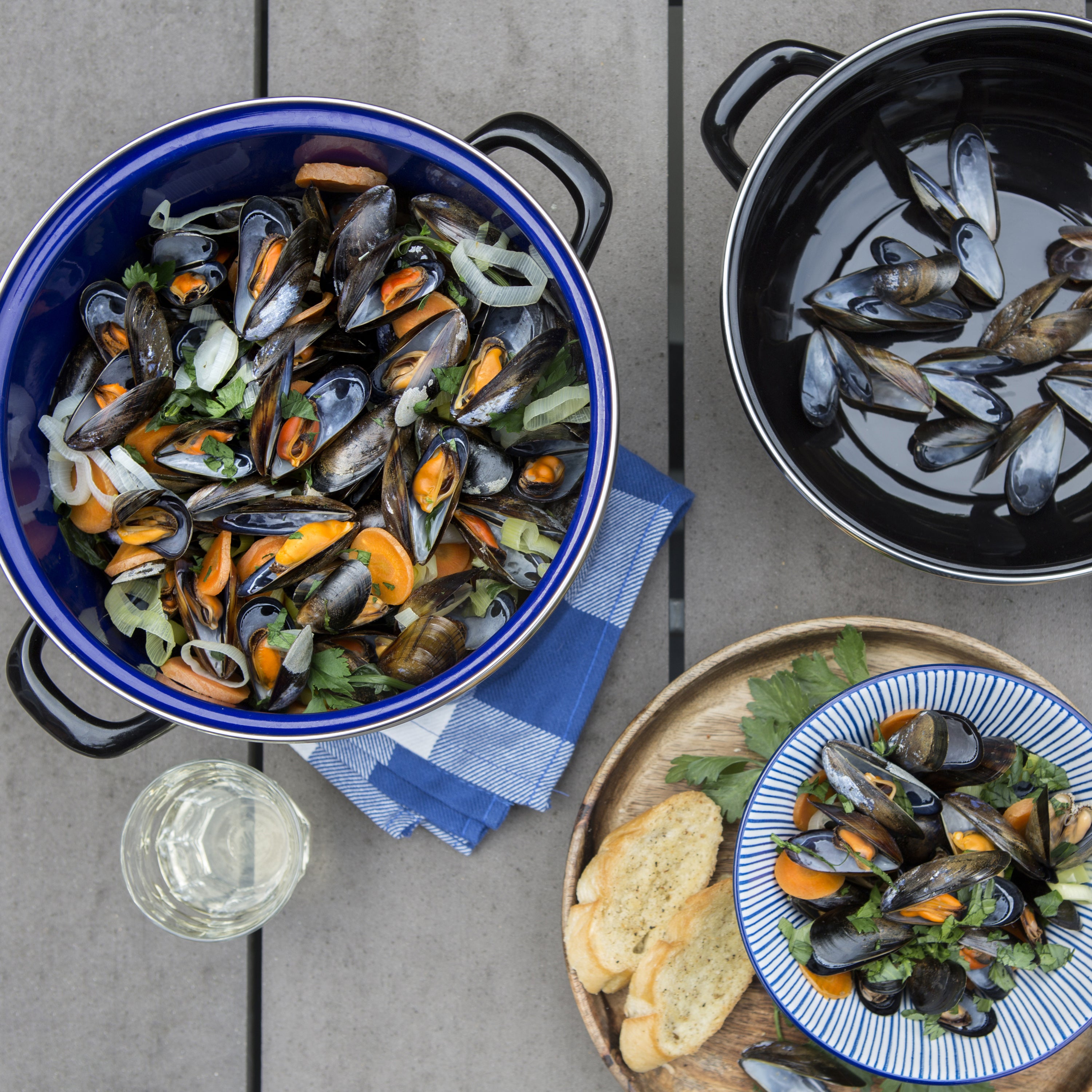 - Ruime mosselpan met een inhoud van 2 liter