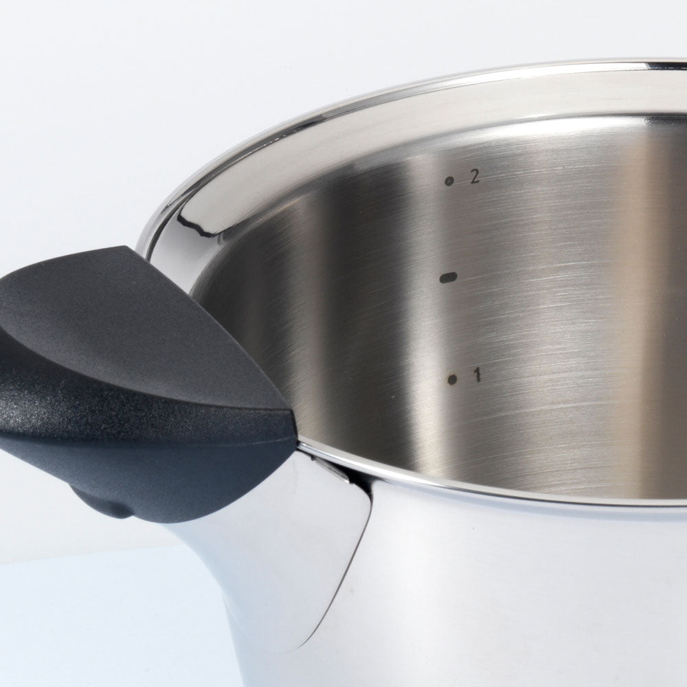 Veilig door uniek afgietsysteem Het is mogelijk om het kookvocht af te gieten zonder de deksel vast te hoeven houden. Draai het deksel een kwartslag om hem te vergrendelen. Zo heb je beide handen vrij om de pan goed vast te houden en is het veilig om af te gieten of uit te schenken. Het deksel is zo sterk dat je een (lege) pan kunt optillen aan het deksel wanneer deze vergrendeld is. Zodra het deksel vergrendeld is heeft het twee gleuven om af te gieten die ook de stoom kunnen vrijlaten. Wat ook nog handig is, is de maatverdeling aan de binnenzijde van de pan!