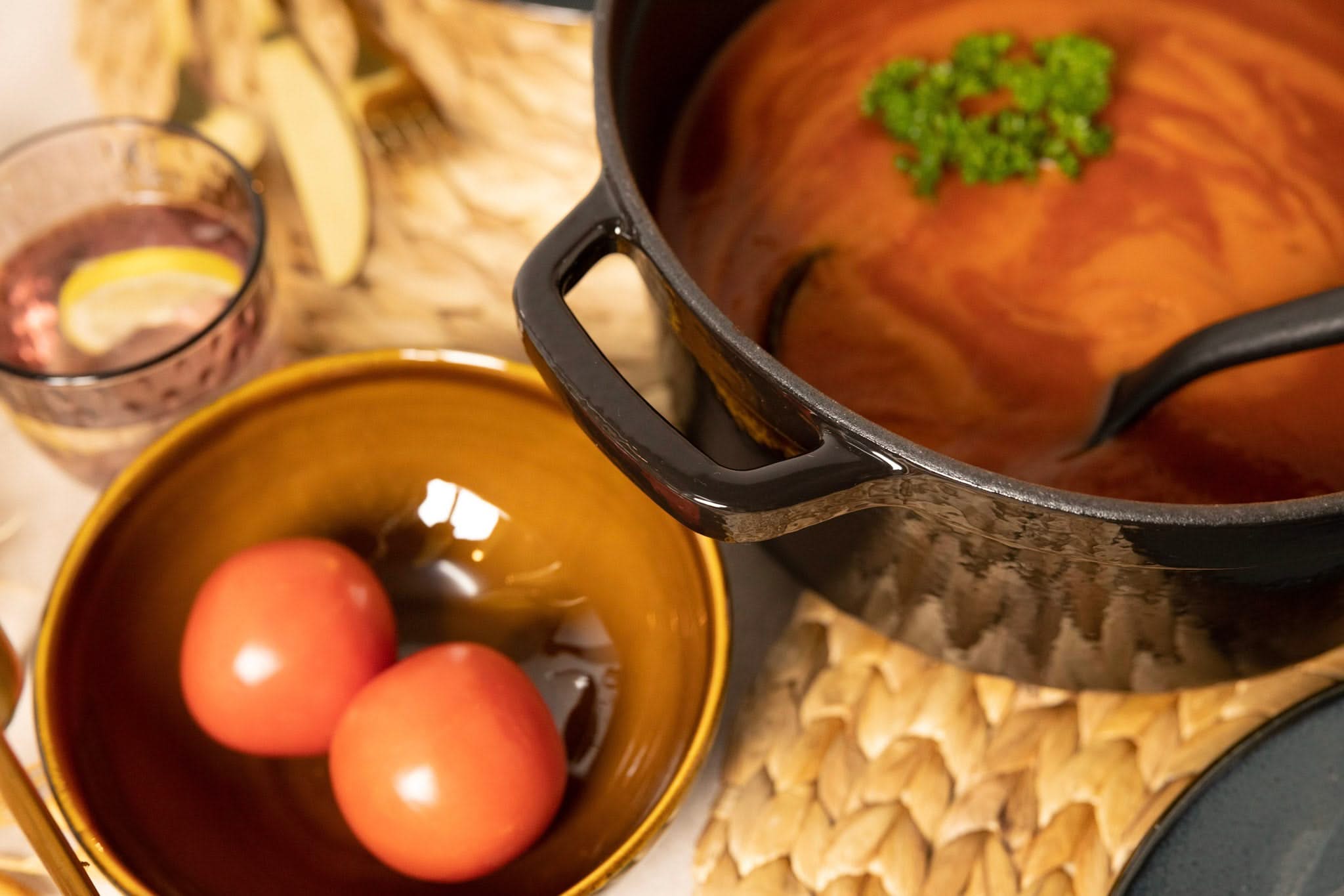 - Binnenzijde deksel voorzien van ronde puntjes, om vocht vast te houden en te verdelen tijdens het kookproces.