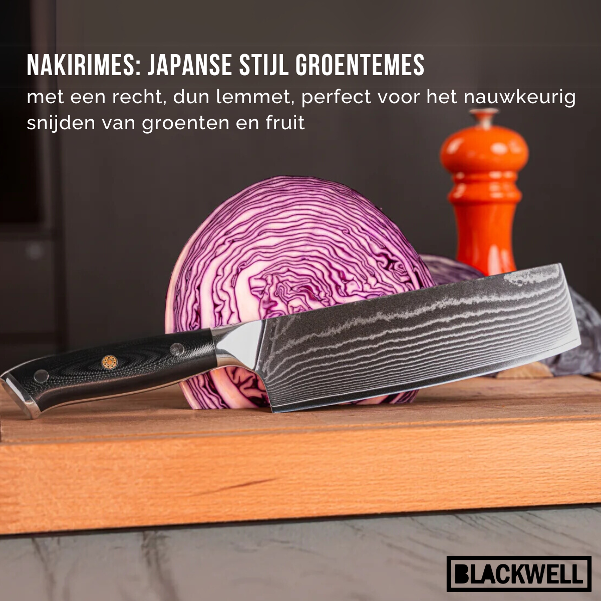 Investeer in kwaliteit en precisie met de Blackwell messenset. Of je nu een eenvoudige maaltijd bereidt of bezig bent met een culinair meesterwerk, dit mes staat altijd klaar om je te ondersteunen in de keuken. Ontdek het vandaag bij Cookinglife en ervaar het verschil! Voordelen van de Blackwell Messenset (Koksmes + Groentemes + Officemes) - Japanse stijl - 67 lagen damaststaal - VG10 - 3 delig