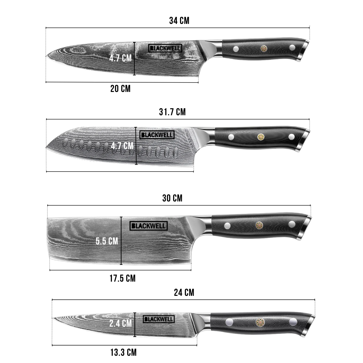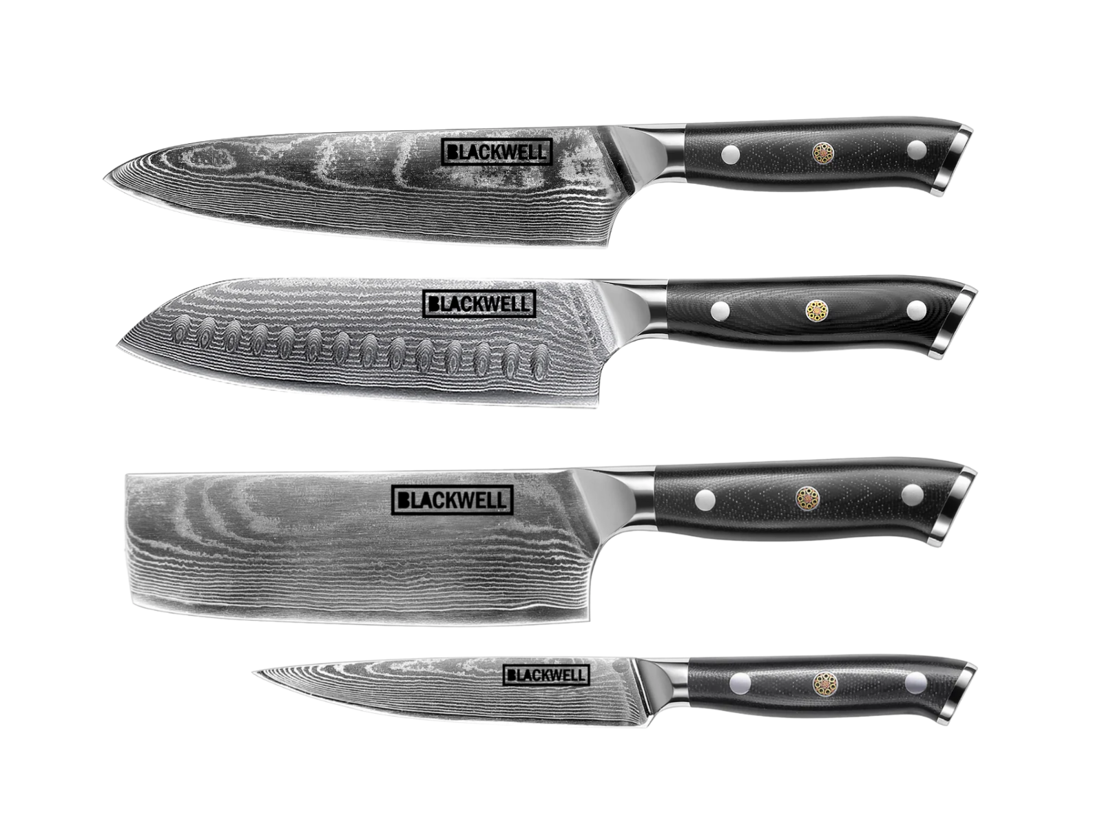 De Blackwell messenset is de perfecte keuze voor zowel de enthousiaste thuiskok als de professionele chef. Deze 4-delige set combineert de superieure scherpte van Japans VG10 staal met de duurzaamheid en schoonheid van 67-laags damaststaal. Een onmisbare toevoeging aan elke keuken, waarmee je moeiteloos en stijlvol al je snijtaken uitvoert.