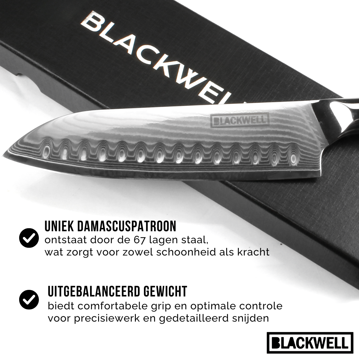 Het Blackwell Santokumes is gemaakt van hoogwaardig damaststaal, dat bekendstaat om zijn uitzonderlijke scherpte en duurzaamheid. Door de meerlaagse constructie van het staal behoudt het mes langer zijn scherpe rand. Hierdoor snijdt u moeiteloos door vlees, groenten en kruiden. Bovendien geeft het unieke damascuspatroon het mes een opvallend uiterlijk en weerspiegelt het de zorgvuldige vakmanschap. Ergonomisch ontwerp voor comfort en controle