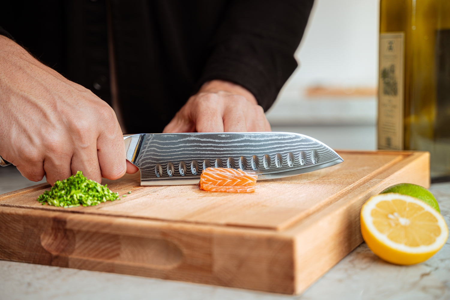Bovendien is het Santokumes zeer veelzijdig. Het woord "santoku" betekent letterlijk "drie deugden" in het Japans, verwijzend naar hakken, snijden en fijnhakken. Het Blackwell Santokumes Damascus is ideaal voor het verwerken van;