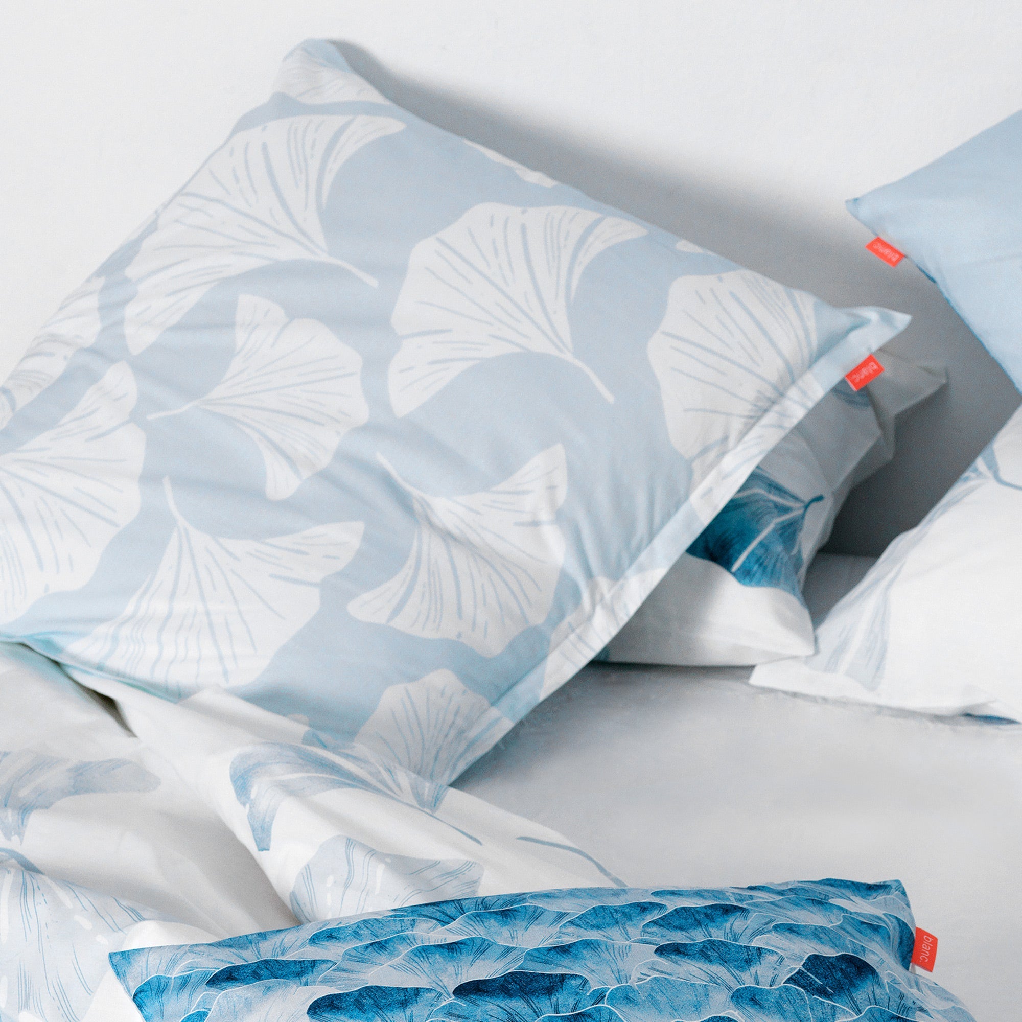 De koele blauwe tinten en de twee interpretaties van het waaiervormige gingkobladontwerp met twee lobben, zoals te zien is op de Gingko kussenhoes uit de Blanc collectie, voegen een gevoel van diepte toe aan je beddengoed en creëren tegelijkertijd een ontspannen en moderne look. Het precieze contrast van de blauwe tinten wordt bereikt door high definition digitaal printen, met de extra kwaliteitsgarantie dat het gemaakt is in Spanje.