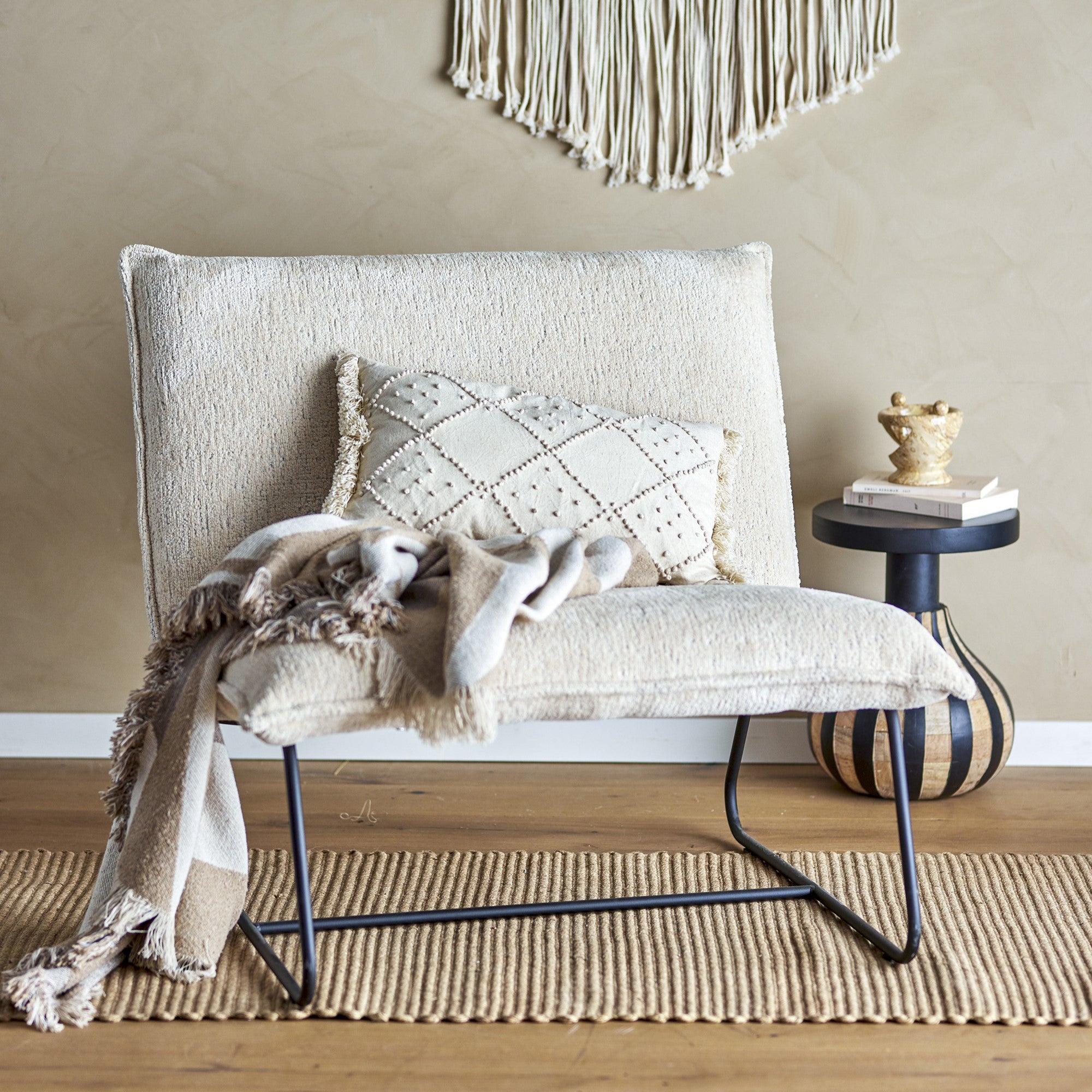 - Gemaakt van metaal en gerecycled polyester en bekleed met zachte bouclé stof