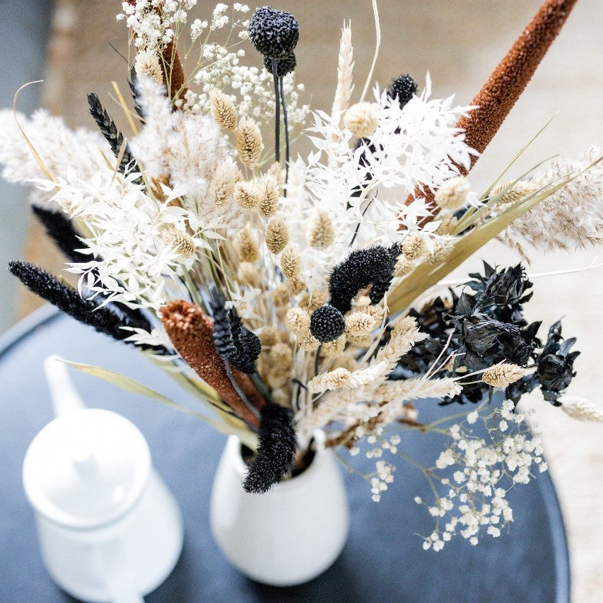 Verrassend mooi boeket droogbloemen met de naam Emma. Verschillende natuurlijke droogbloemen aangevuld met zwarte accenten. Boeket Emma staat garant voor minimaal 6 maanden genot in jouw interieur. Koop nu jouw boeket Emma en geniet maanden van deze prachtige droogbloemen in naturelle kleuren met zwarte accenten. Alle droogboeketten van Bries aan Zee worden handmatig samengesteld en gebonden op basis van kwaliteit en beschikbare voorraad. Het te ontvangen boeket kan dus (licht) van het boeket op de foto's maar zal zeker niet minder mooi zijn.