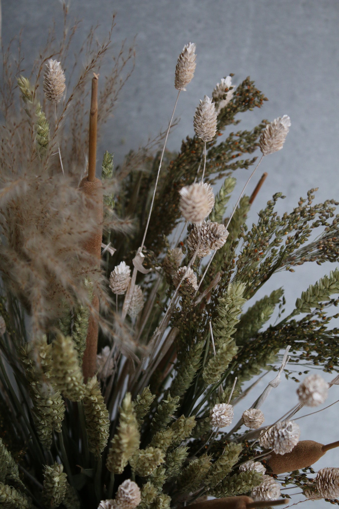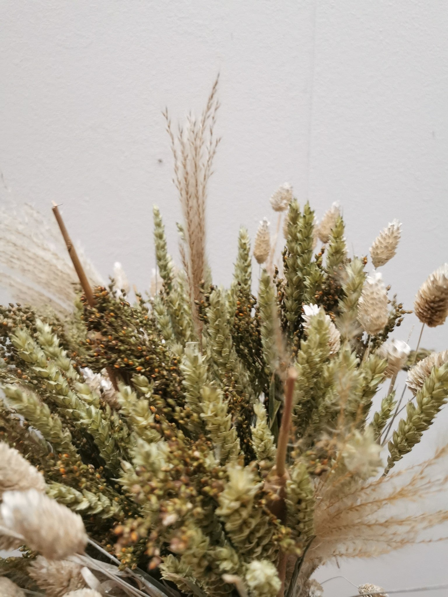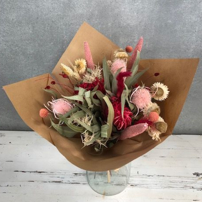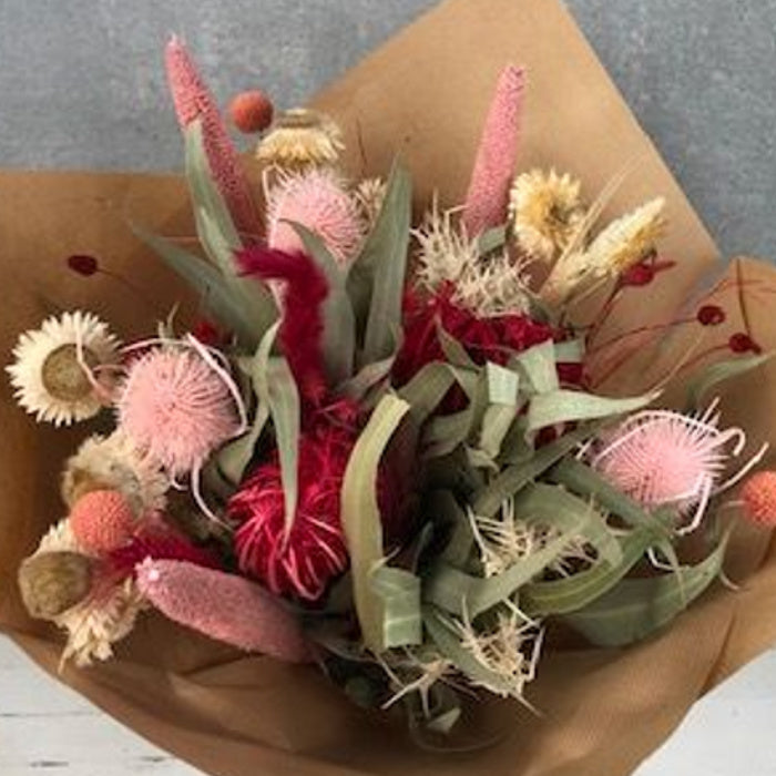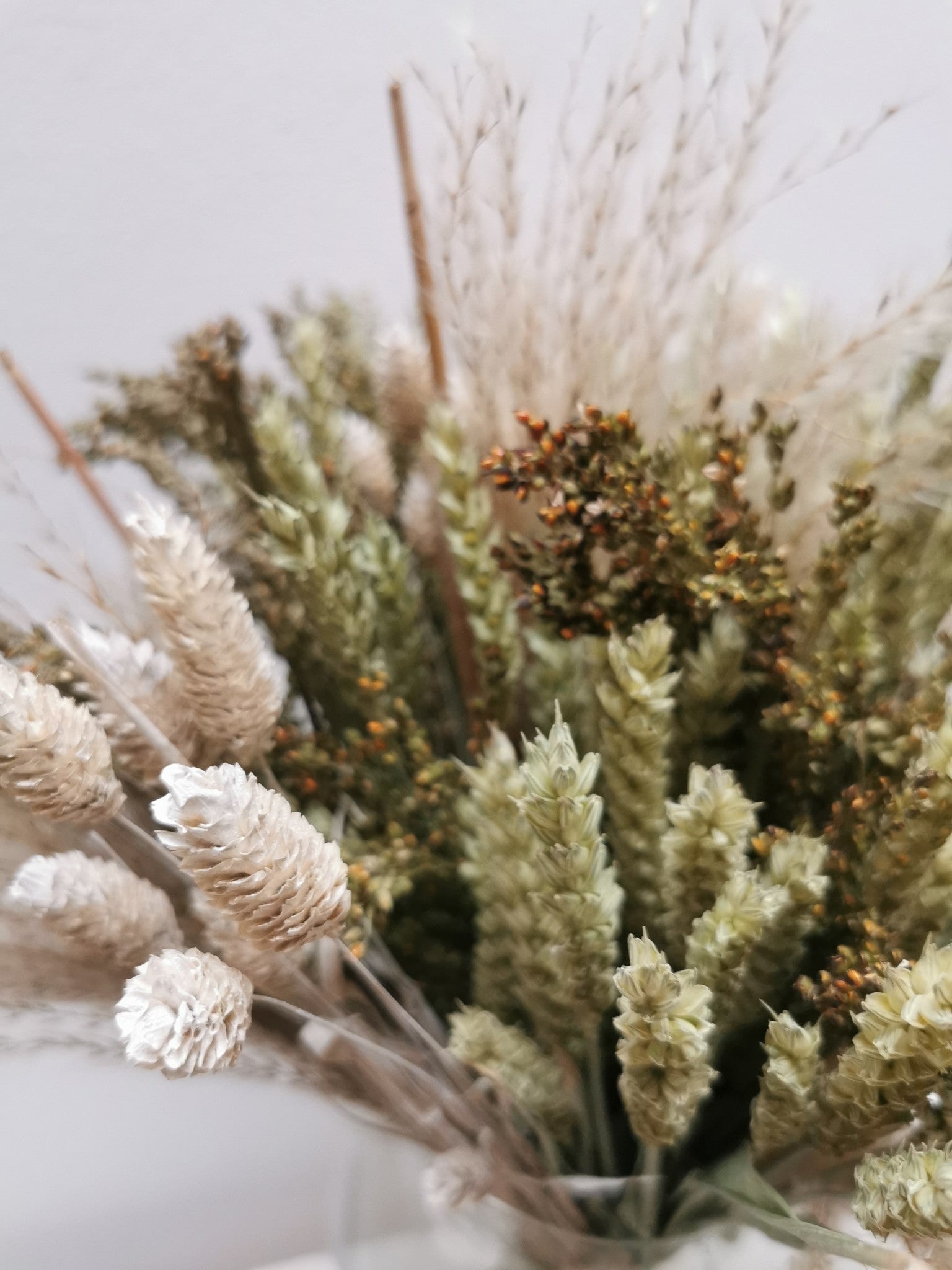 Boeket Jennifer is een warm boeket vol roze en witte droogbloemen aangevuld met fris groen blad van eucalyptus. Een warme uitstraling in jouw interieur.