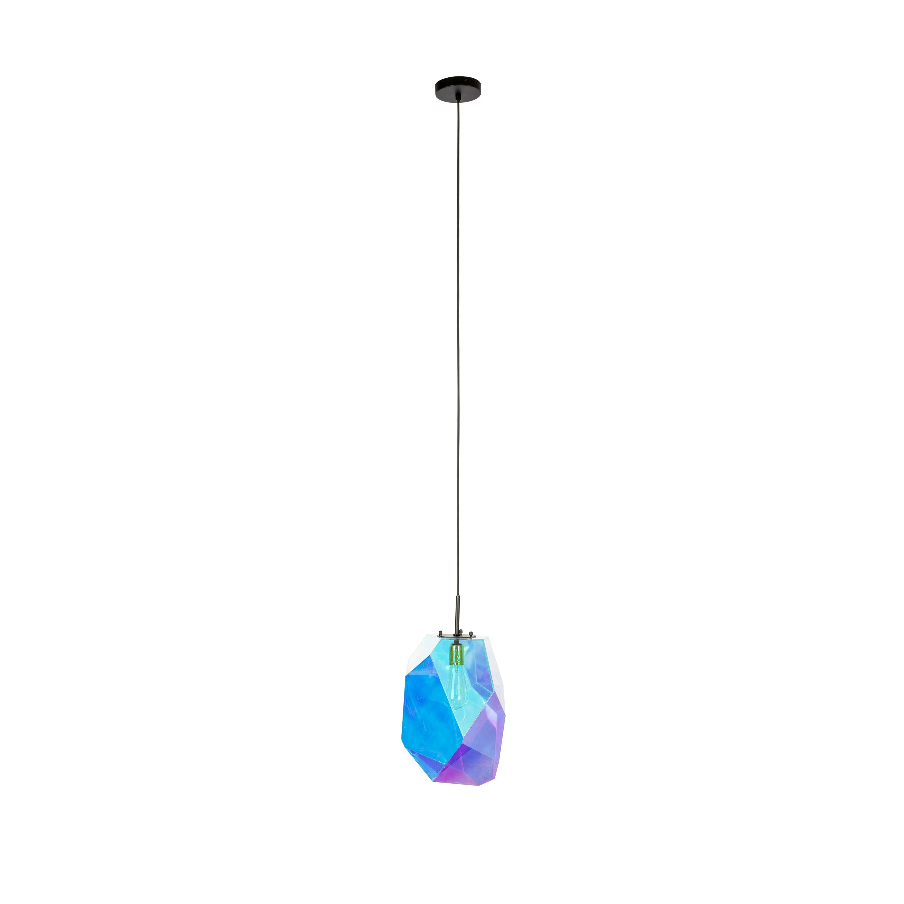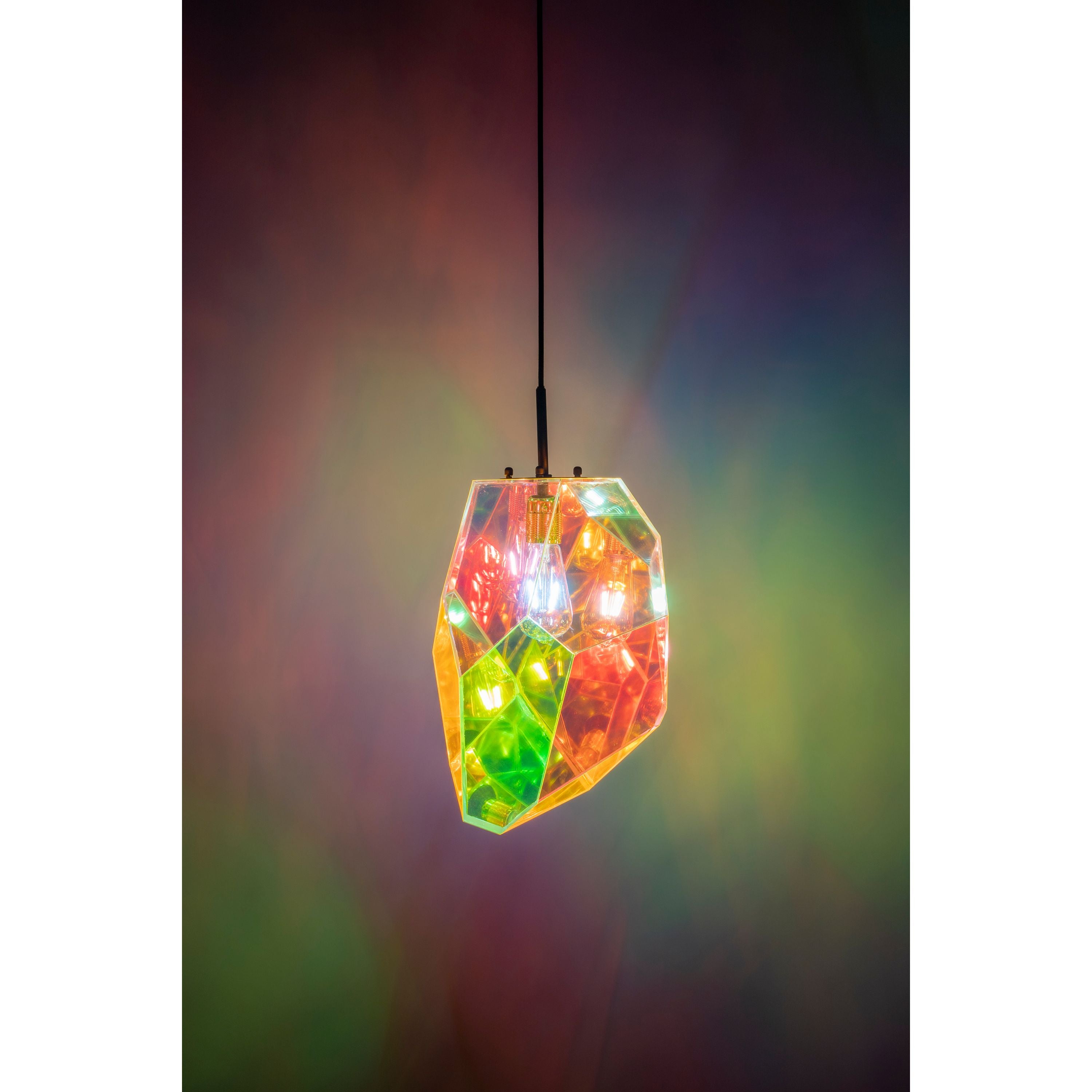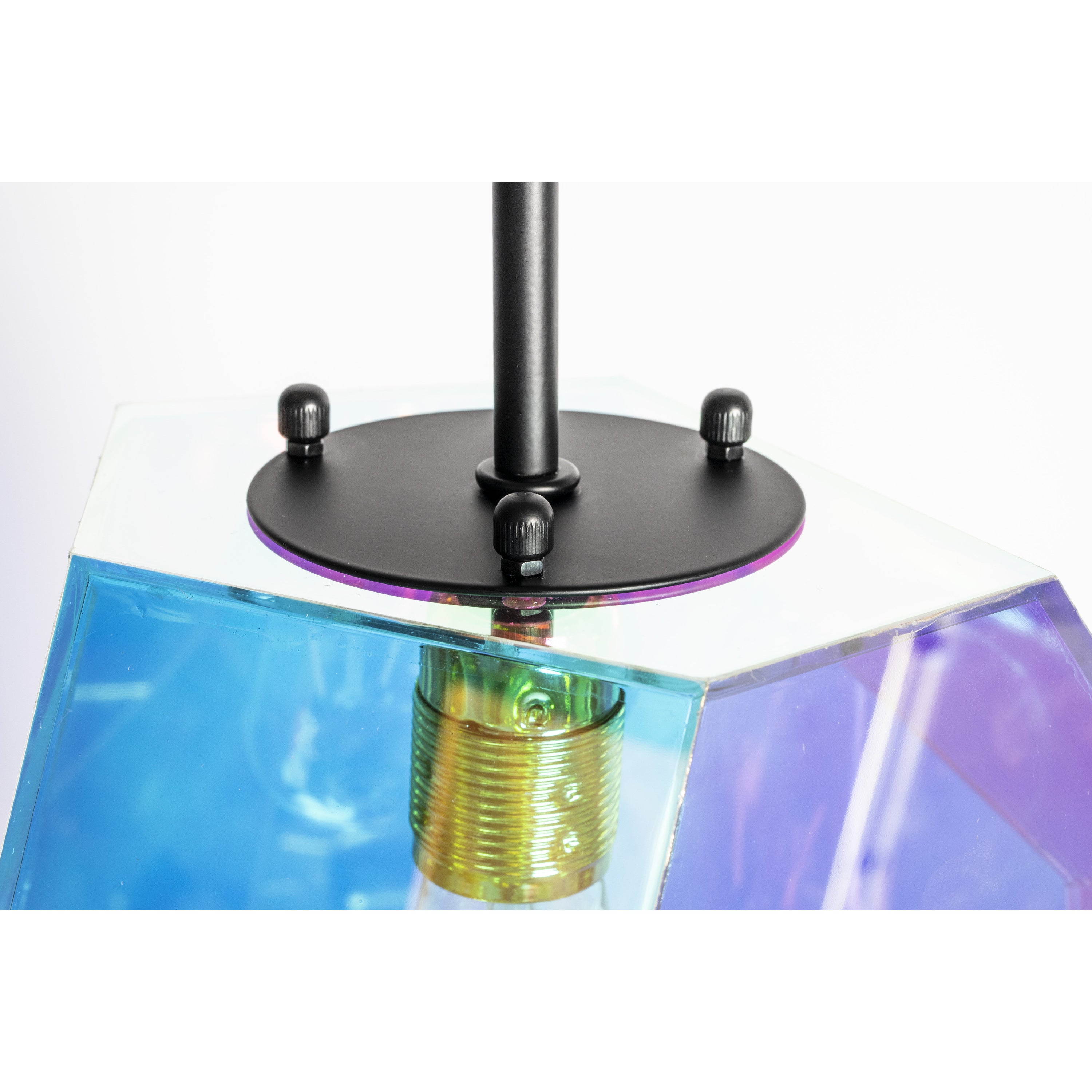 - De lampenkap is gemaakt van holografisch plexiglas, waardoor de kamer wordt gevuld door regenboogkleurig licht.
