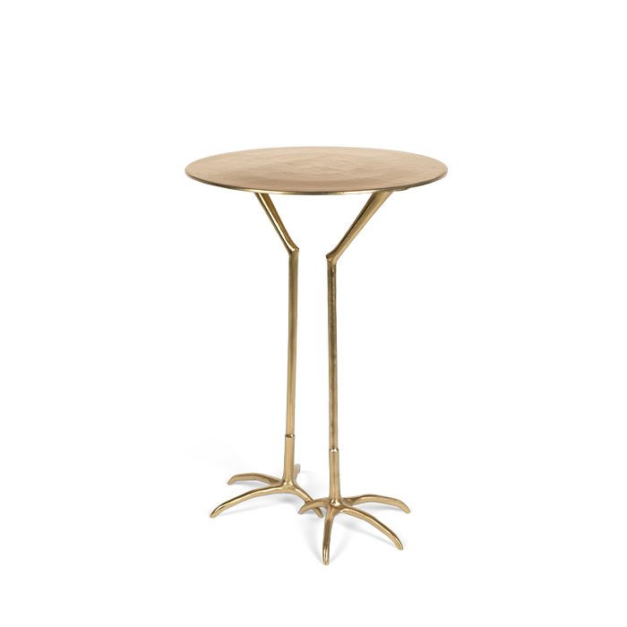 - Het goudkleurige tafelblad staat op hoge vogelpoten