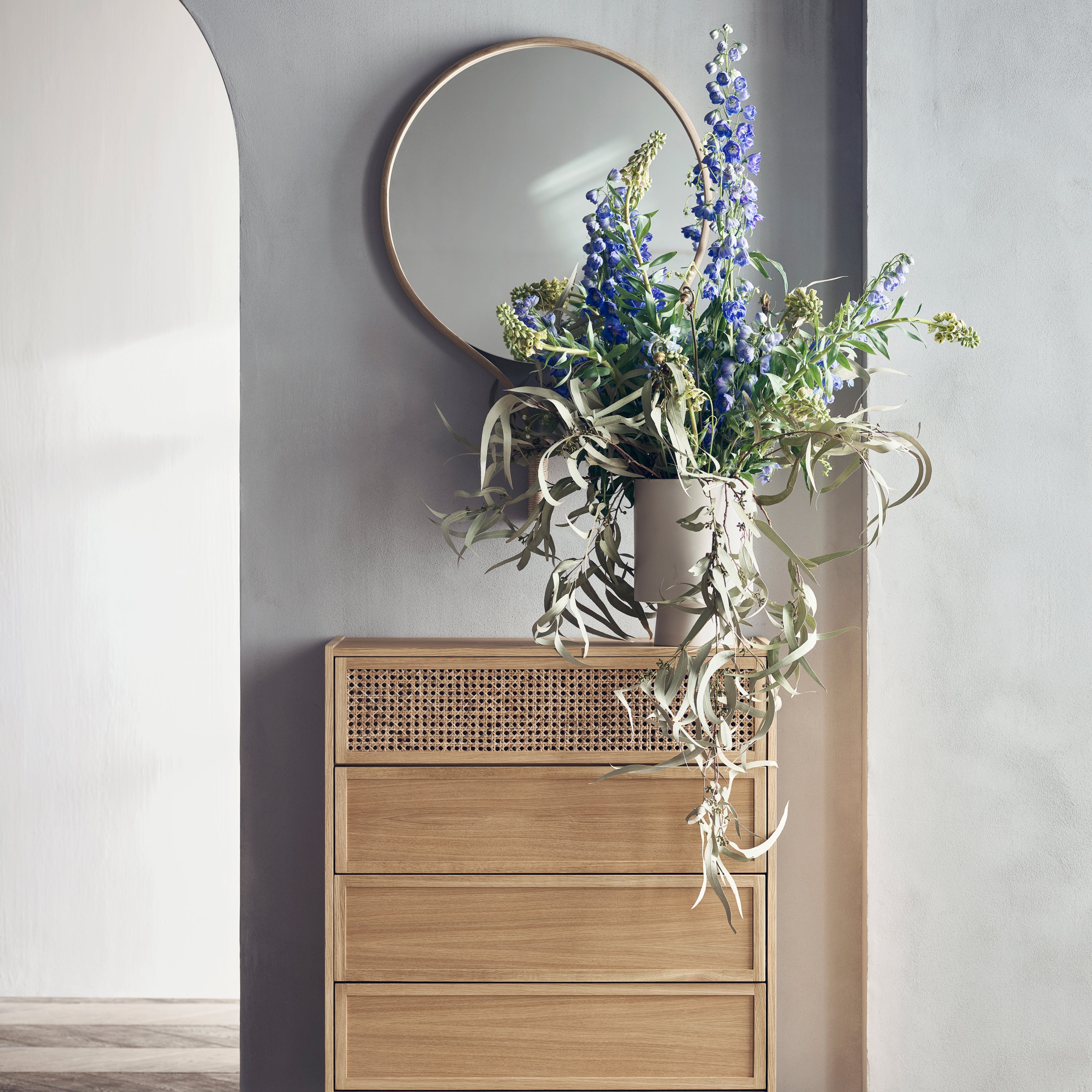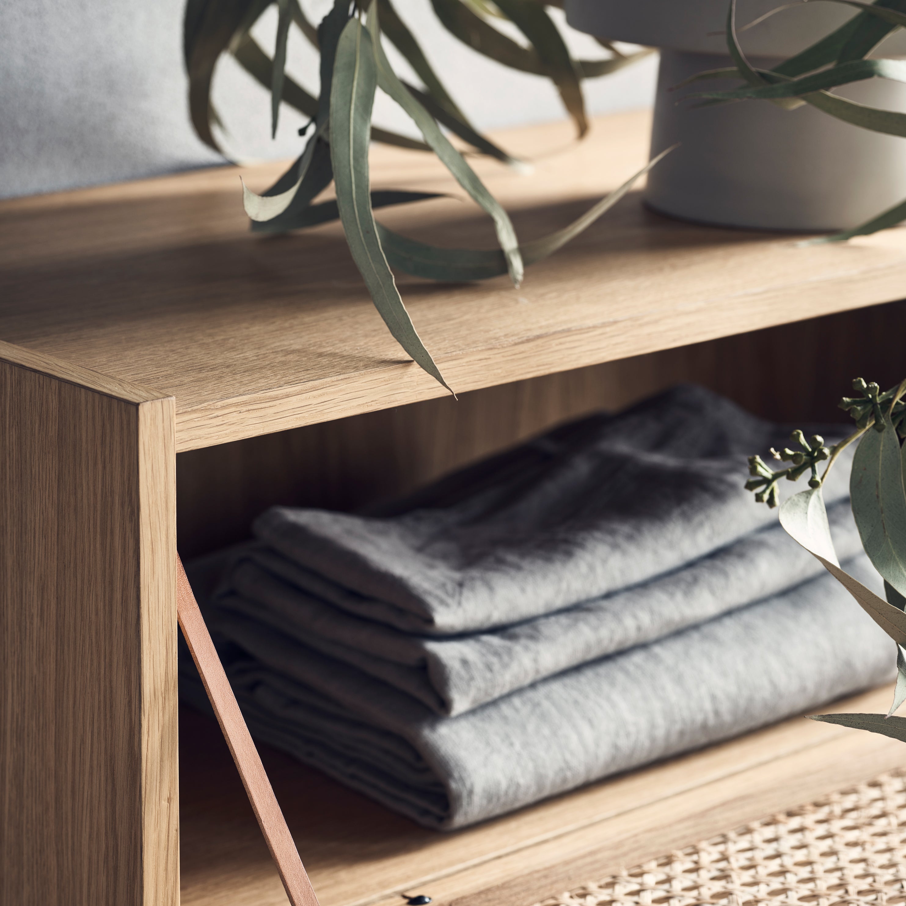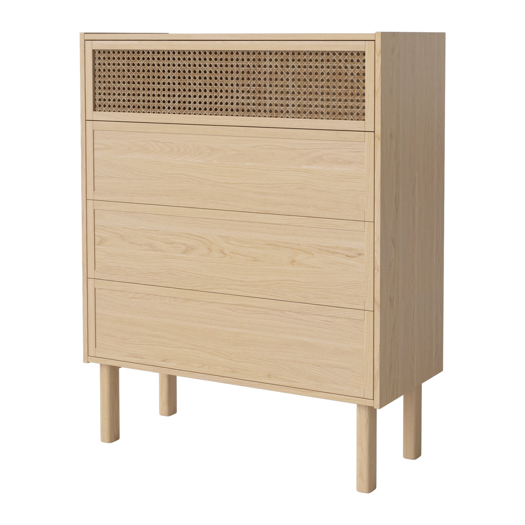 - Drie ruime lades en een extra opbergvak achter de rotan deur voor extra opbergruimte