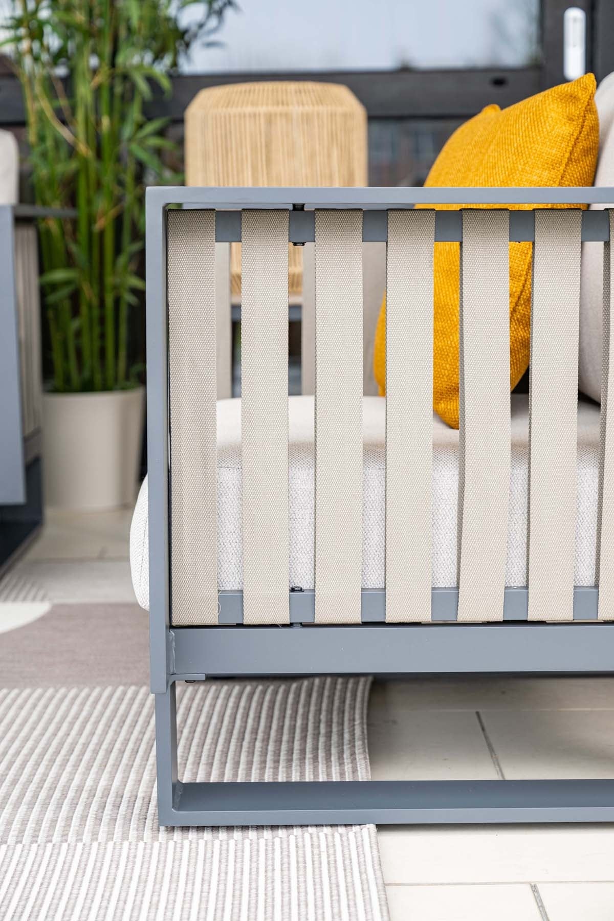 De Bologna stoel heeft een robuuste uitstraling, dankzij de brede armleuningen en de chique, stoffen band die de zijkanten van de armleuningen afwerkt. Het frame is gemaakt van onderhoudsarm, gepoedercoat aluminium, wat makkelijk te onderhouden is door het af te nemen met een zachte, vochtige doek.