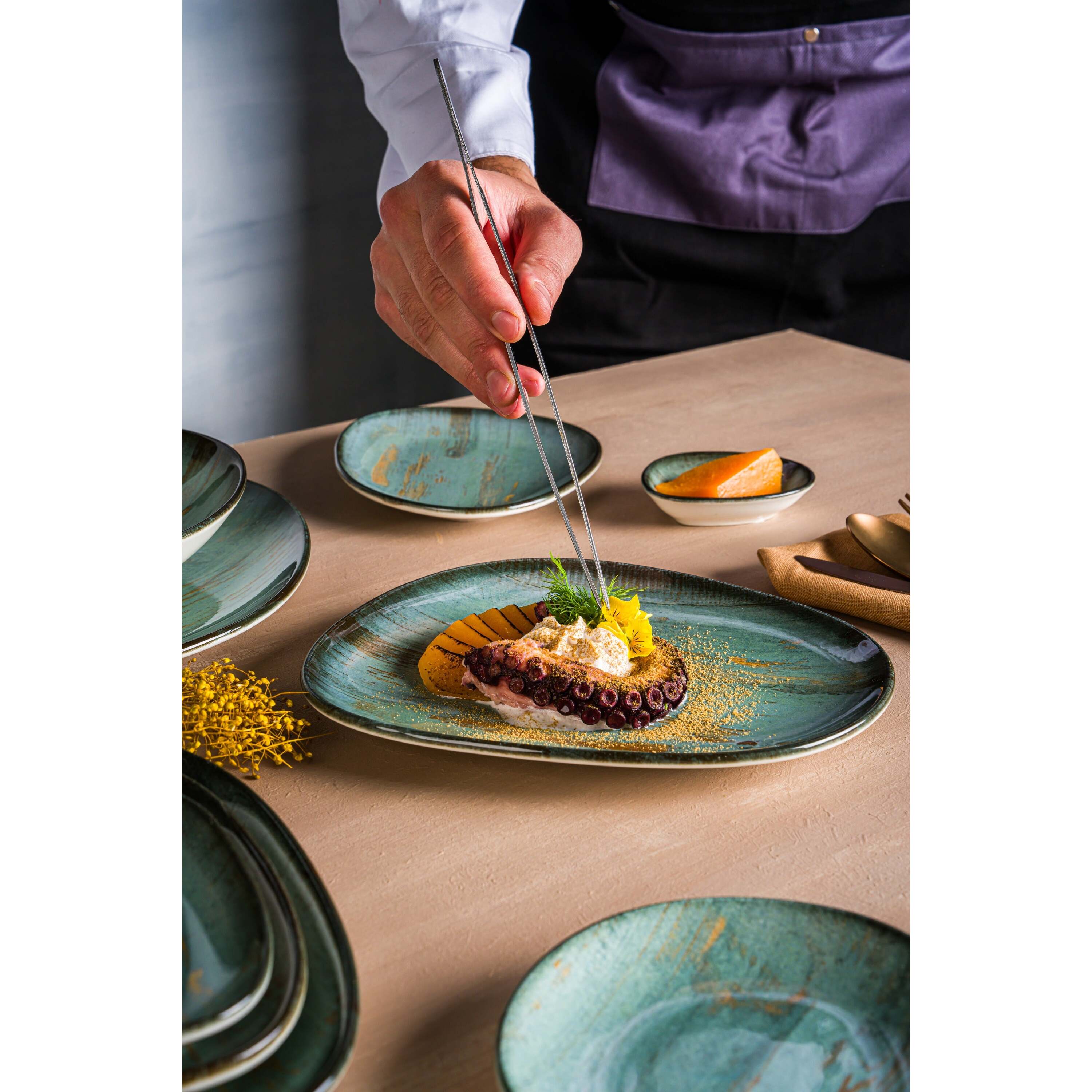 Door gebruik te maken van de verrassende harmonie van groene en heldere kopertinten, spreekt Madera Mint Collection chefs aan die op zoek zijn naar een ander en ambitieus speelterrein voor hun presentaties. Met indrukwekkende toonovergangen en willekeurige crack-effecten, versterkt de collectie de achtergrond bij de maaltijd; laat de scène toch over aan het eten zelf, ondanks zijn intense en dominante aanwezigheid.