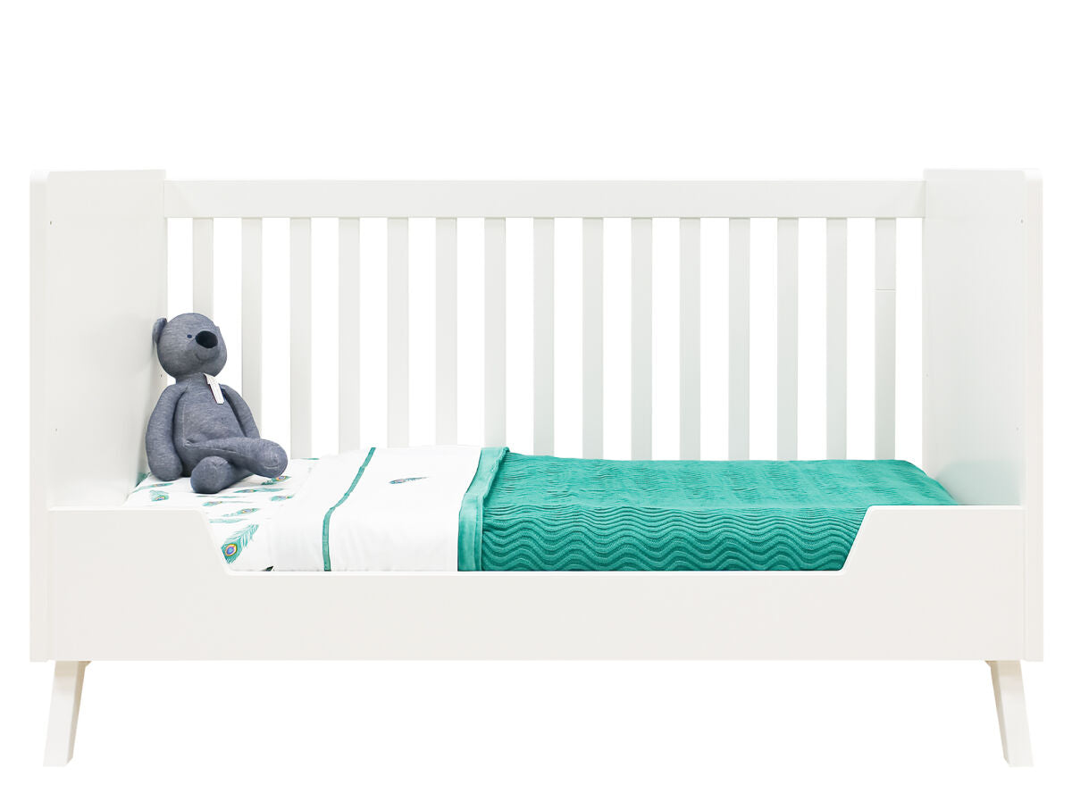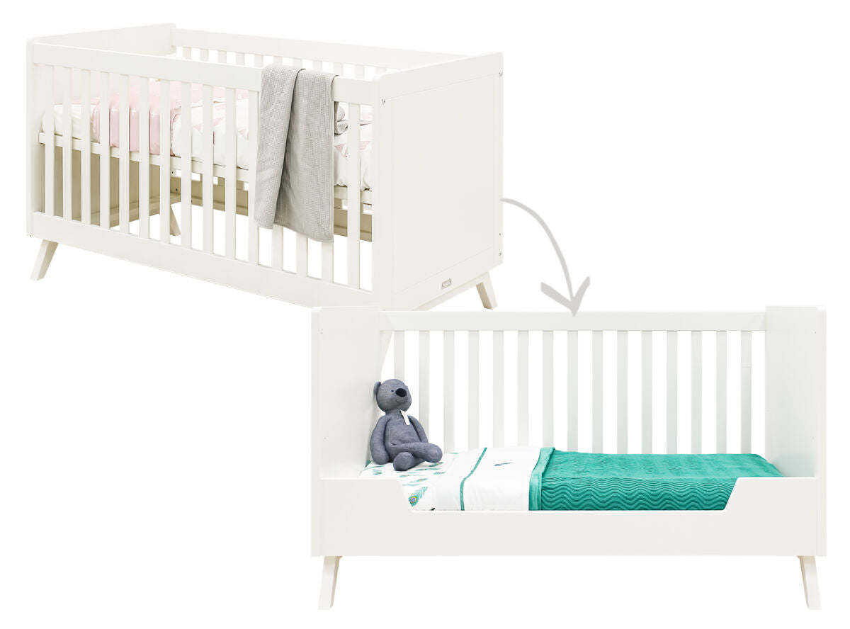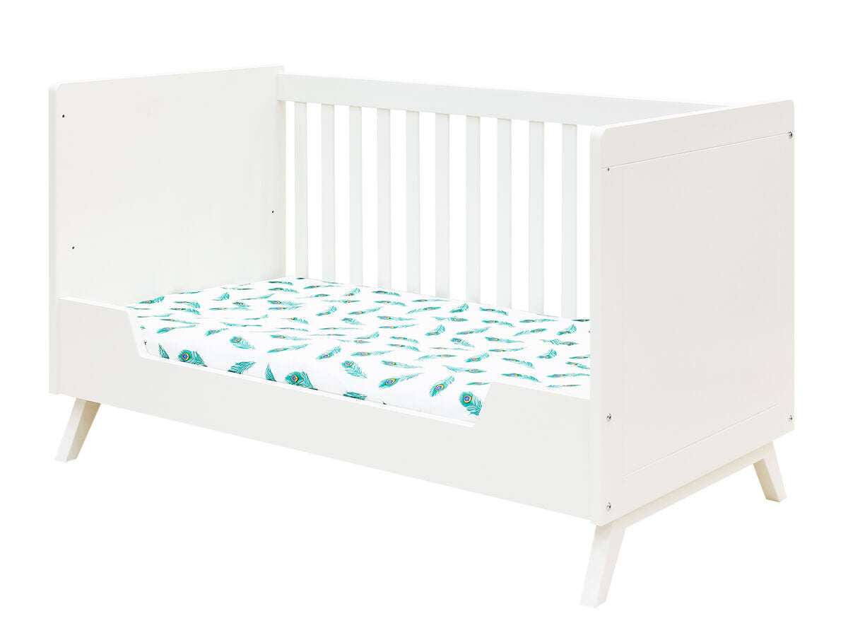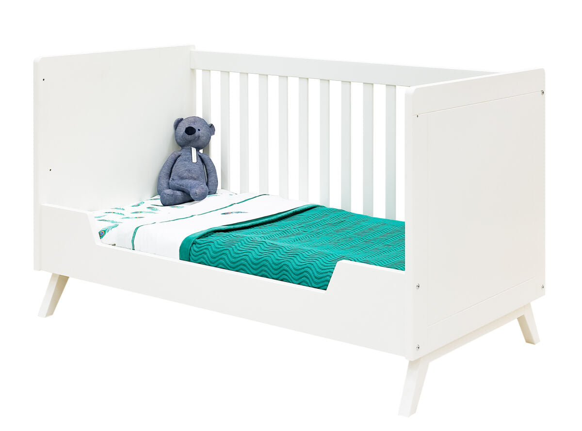 3-Delige babykamer van de serie Anne bestaande uit een ombouwbaar 70 x 140 cm bed, een commode met 3 laden en 2-deurskast. De bodem van het bed is in hoogte verstelbaar. Zodra het kind groter wordt, of zichzelf kan optrekken aan de spijlen, kan je de bodem verlagen. Zo blijft het bed een veilige plek. Dit bed kan je ombouwen naar een bedbankje, waardoor het kind kan wennen aan het zelfstandig in- en uitstappen. En je hebt langer plezier van het bed! Combineer deze kamer met het bijpassende wandrek of barrier.