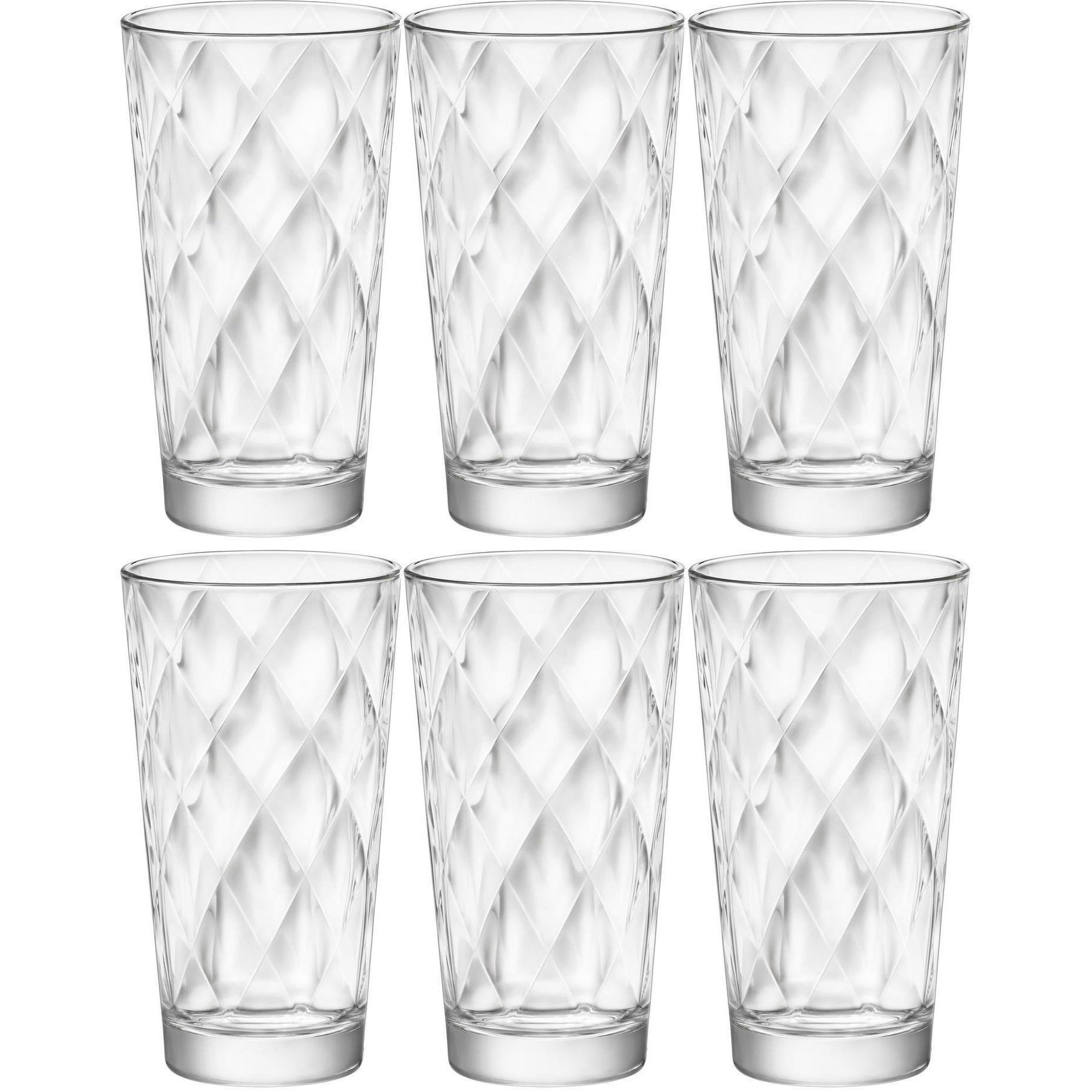 Set van 6x stuks waterglazen/longdrinkglazen met ruit patroon, in helder transparant glas van 370 ml. Afmetingen: ca. 9 x 14 cm. Vaatwasmachinebestendig: ja. Materiaal: hardglas. Drinkglazen geschikt voor water, sap en frisdrank.