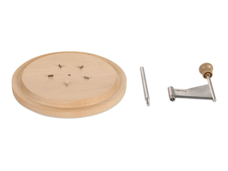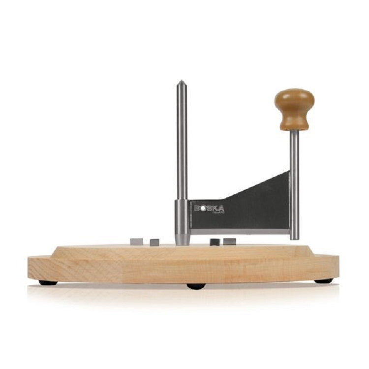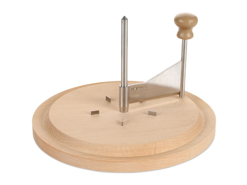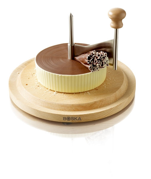 Kaaskruller Amigo van het merk Boska. Geniet van flinterdunne plakjes kaas, heerlijk bij de borrel of als dessert. Met deze kaaskruller schaaft u flinterdunne kaaskrullen van de Tête-de-Moine, een wereldberoemd halfhard kaasje uit de Zwitserse Jura. Zo geniet u optimaal van de authentieke smaak. Daarbij staat deze beukenhouten kaaskruller prachtig op tafel waardoor u ook over het serveren niet meer hoeft na te denken. De kaaskruller is ook te gebruiken voor het maken van chocolade krullen, voor het decoreren van de mooiste desserts en gebakjes. De set bestaat uit een beukenhouten voet van 23.5cm doorsnee met 5 pinnetjes om de kaas stevig op vast te zetten en een roestvrijstalen pin met mes.