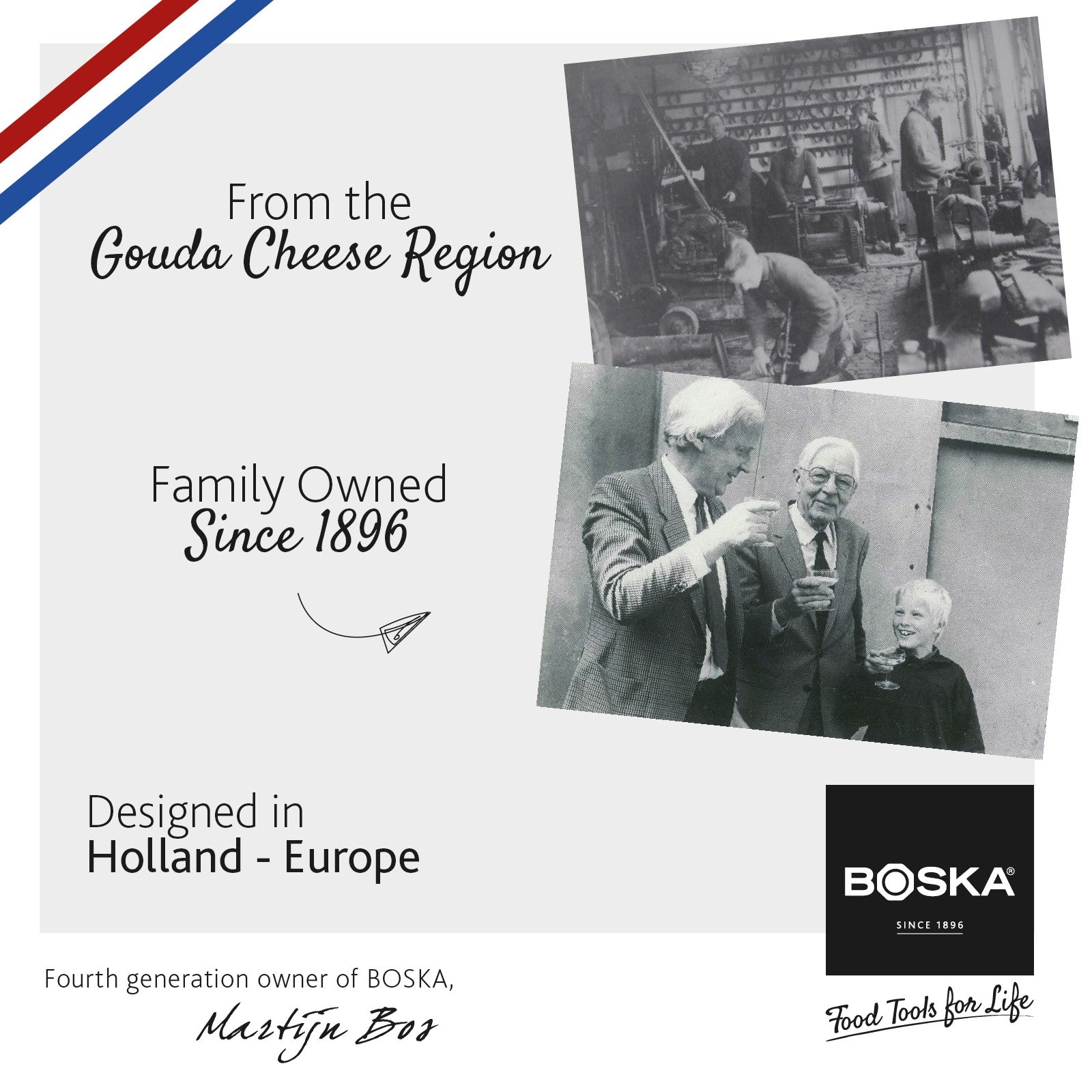 Het merk Boska is opgericht door Willem Bos in Bodegraven. Hij was edelsmid tot het moment dat de kaasboeren gingen vragen om wielen te maken voor de karren die de paarden trokken. Van hieruit is hij steeds meer producten voor de kaasboeren gaan ontwikkelen en daar was het begin van Boska. Nu vele jaren later staat Martijn Bos, als vierde generatie, aan het roer van Boska. HIj heeft ervoor gezorgd dat Boska internationaal ging en wereldwijd het merk voor kaasproducten is geworden! Momenteel heeft het merk Boska het grootste assortiment hoogwaardige kaasaccessoires ter wereld dus voor ieder wat wils!