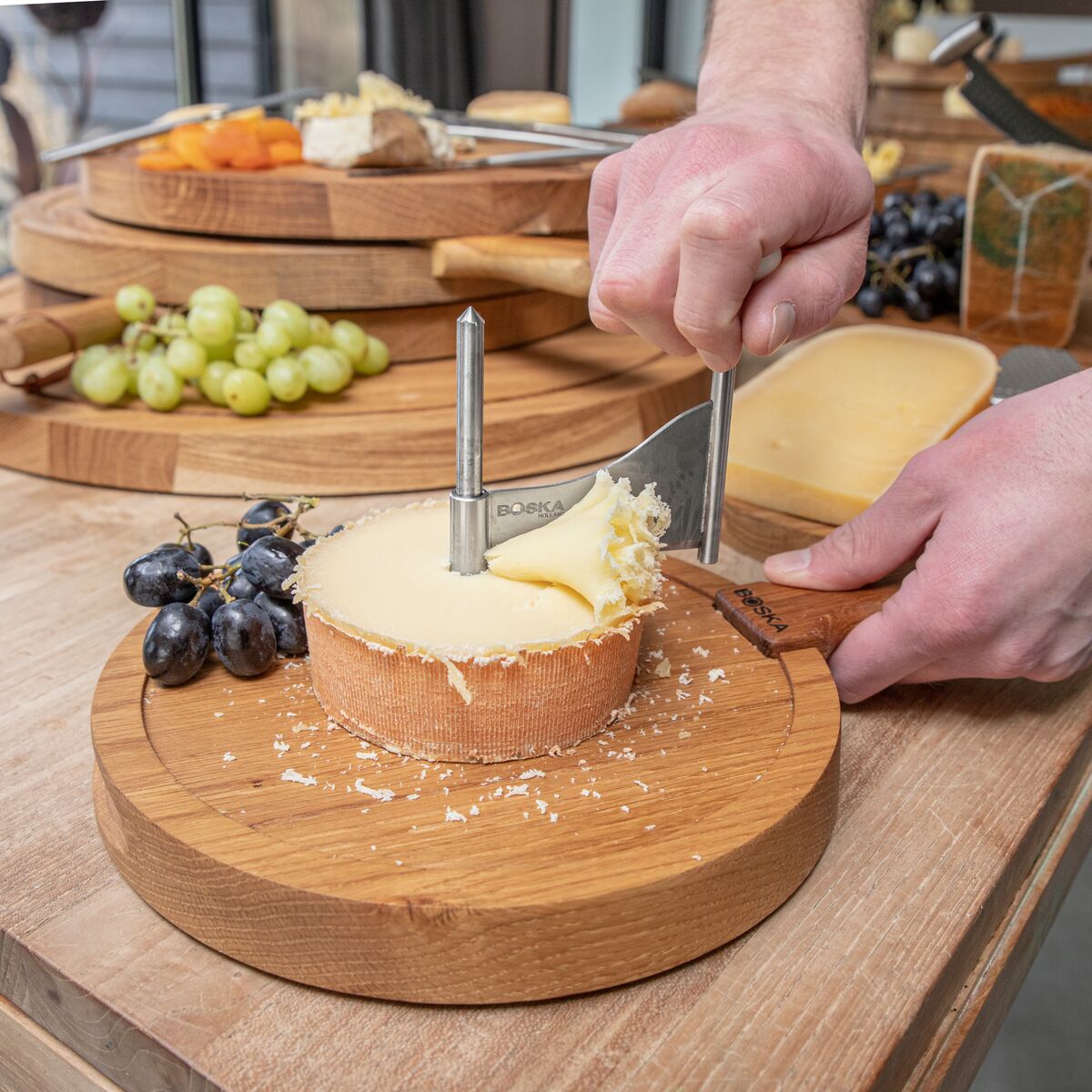 - RVS EN EIKENHOUT: Het extra scherpe roestvrijstalen mes maakt prachtige krullen. De pinnetjes op het plateau zorgen voor extra veel grip op de kaas