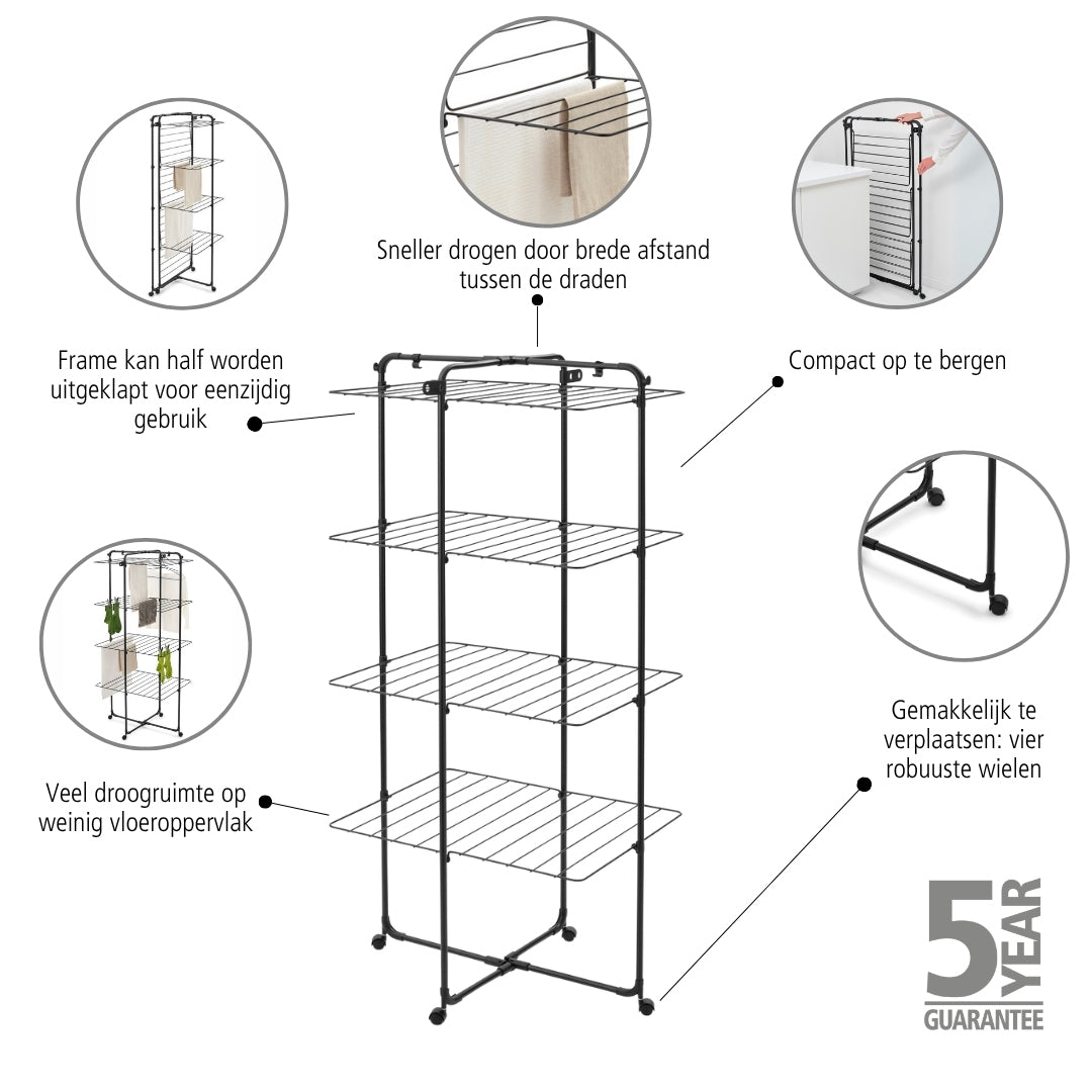 - 4 rekken op meerdere niveaus geven volop ruimte voor elke lading wasgoed