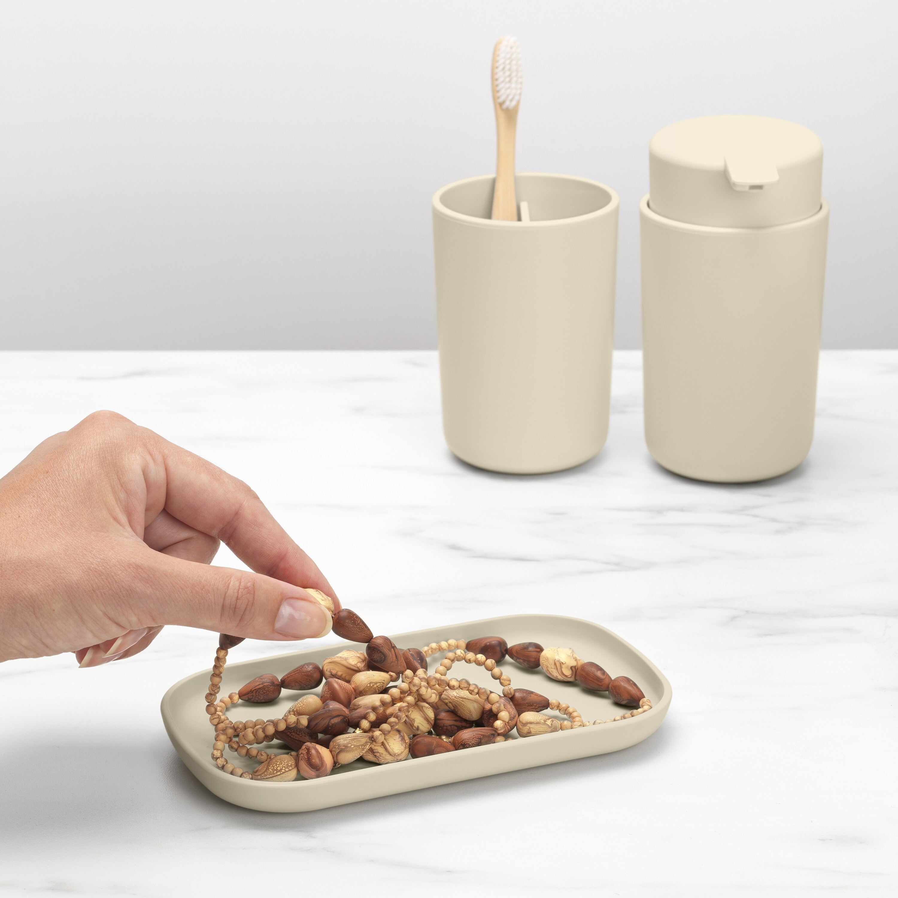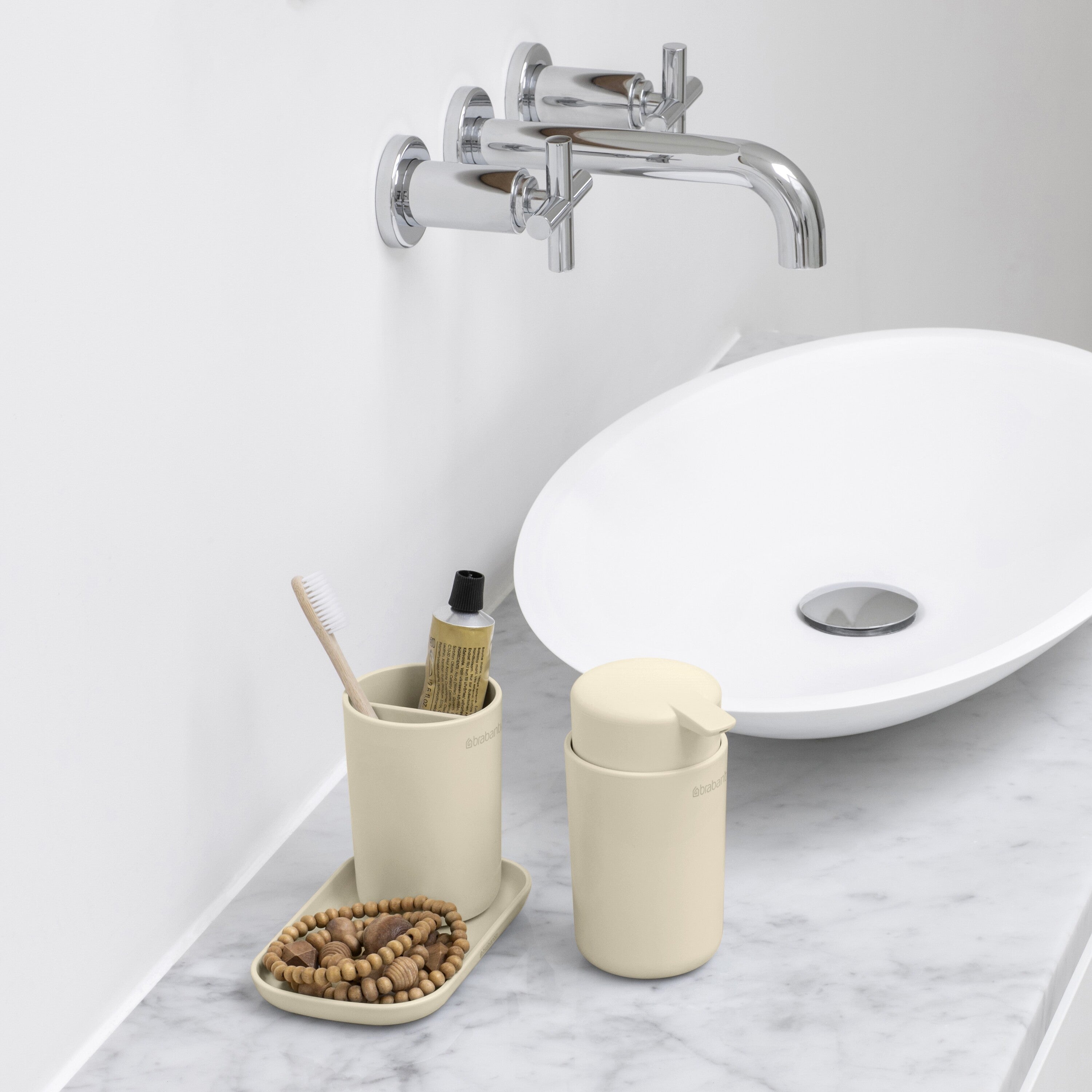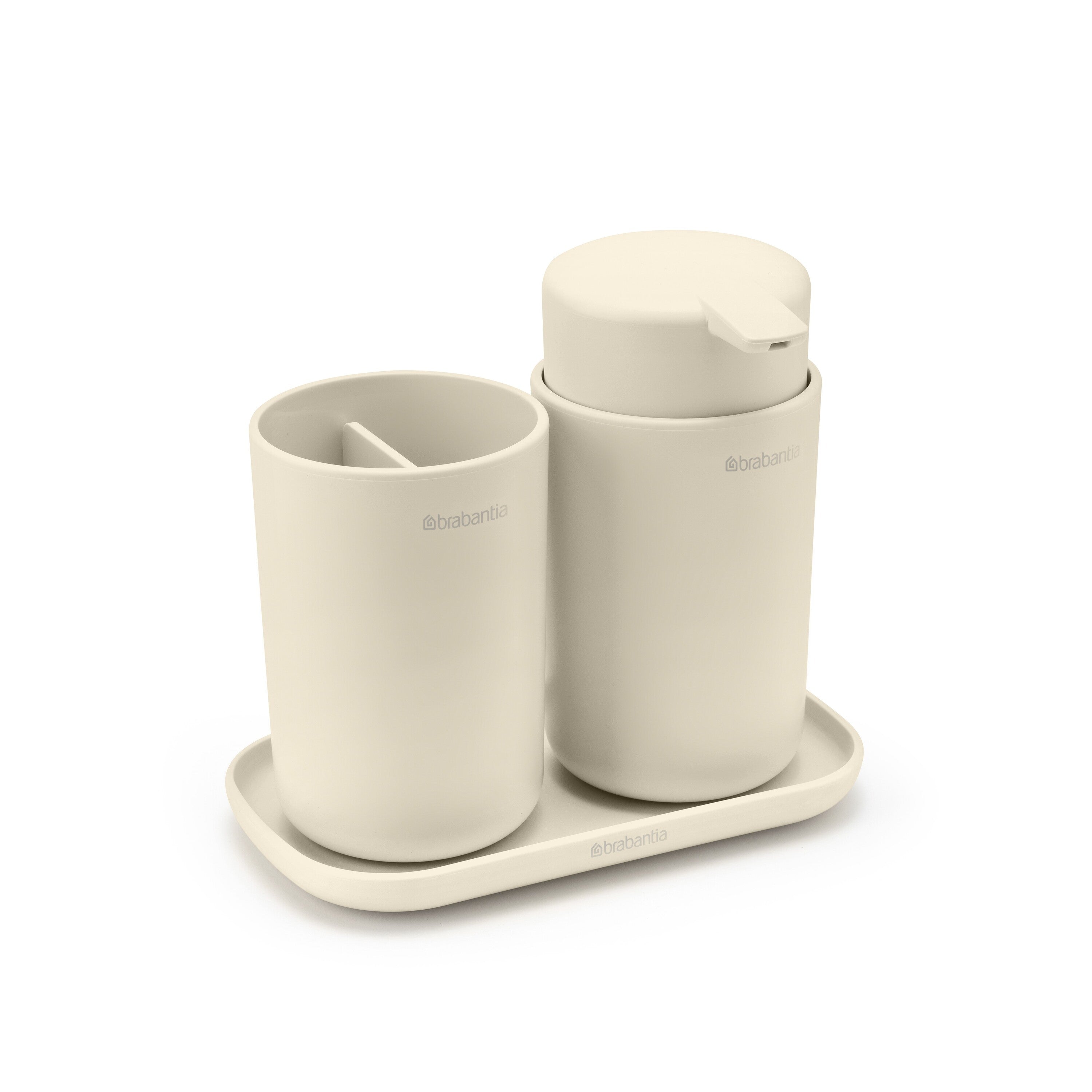 - Set van een zeeppomp en tandenborstelhouder op een schaaltje