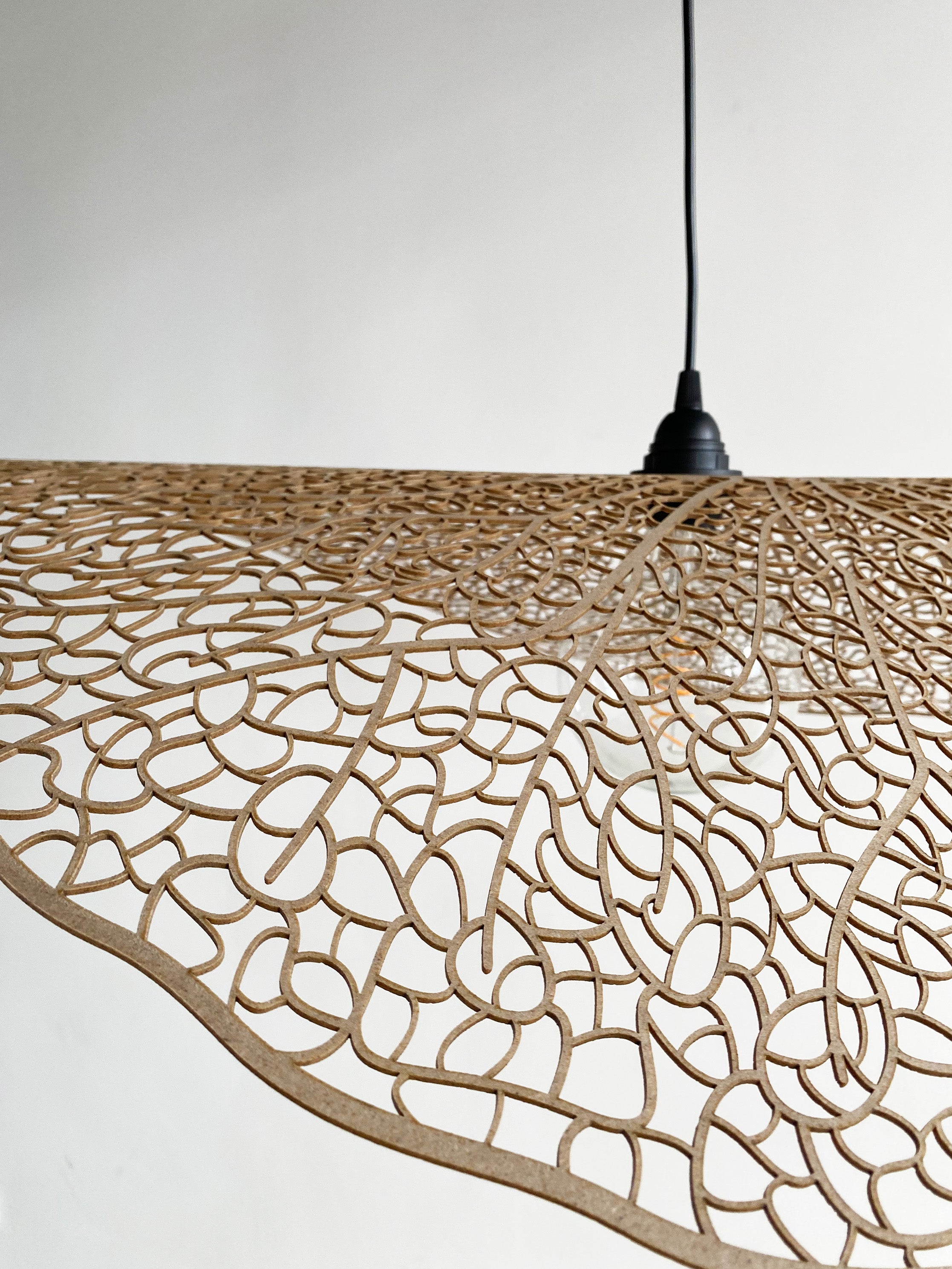 De Leaf hanglamp heeft een bladvorm met bladnerf patroon. Door de organische structuur van deze lampenkap projecteert het de prachtigste lichtpatronen op plafond en muren. Het is dé design hanglamp voor boven je eettafel. Ook voor je hal of trappenhuis is deze design verlichting een unieke toevoeging. Het herhalende ritme van de natuur, wat we lieten terugkomen in deze Dutch Design lamp, is overal om je heen; er wacht een hele wereld tot jouw zintuigen verscherpen en je het opmerkt. De duurzame Leaf lamp is gemaakt van 100% biologisch afbreekbaar materiaal. Ontworpen en handgemaakt in onze eigen werkplaats.
