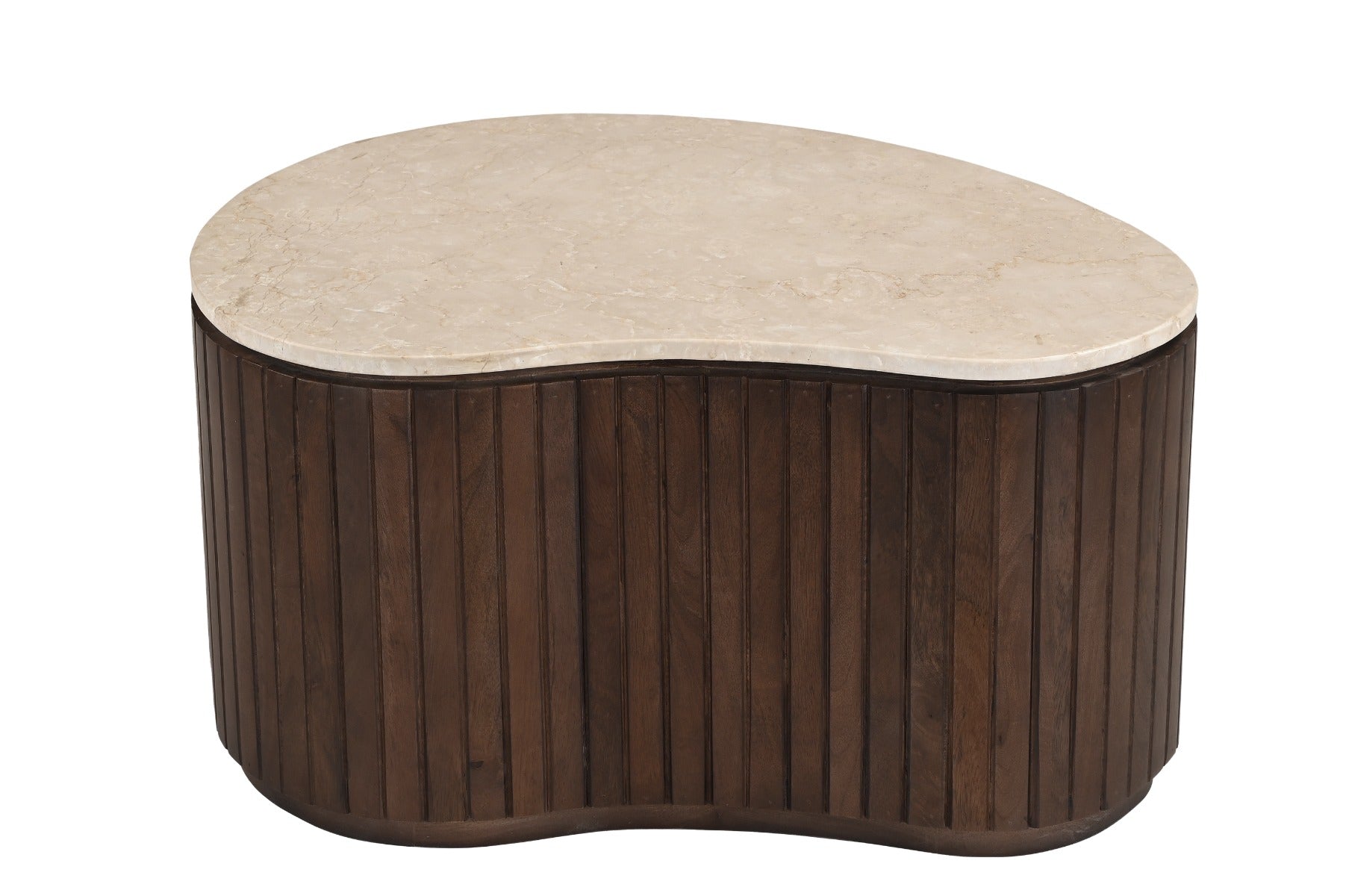 Laat je interieur tot leven komen met de bijzondere vormen van salontafelset Sorai. Deze set bestaat uit twee tafels met een elegant golvend silhouet, geïnspireerd op de vormen uit de natuur. Het warme houten onderstel met verfijnde latstructuur en het zachte natuurstenen blad vormen samen een stijlvol geheel dat rust én karakter uitstraalt. Dankzij de speelse asymmetrie en het praktische bij elkaar schuiven is deze set niet alleen mooi om te zien, maar ook functioneel in gebruik.
