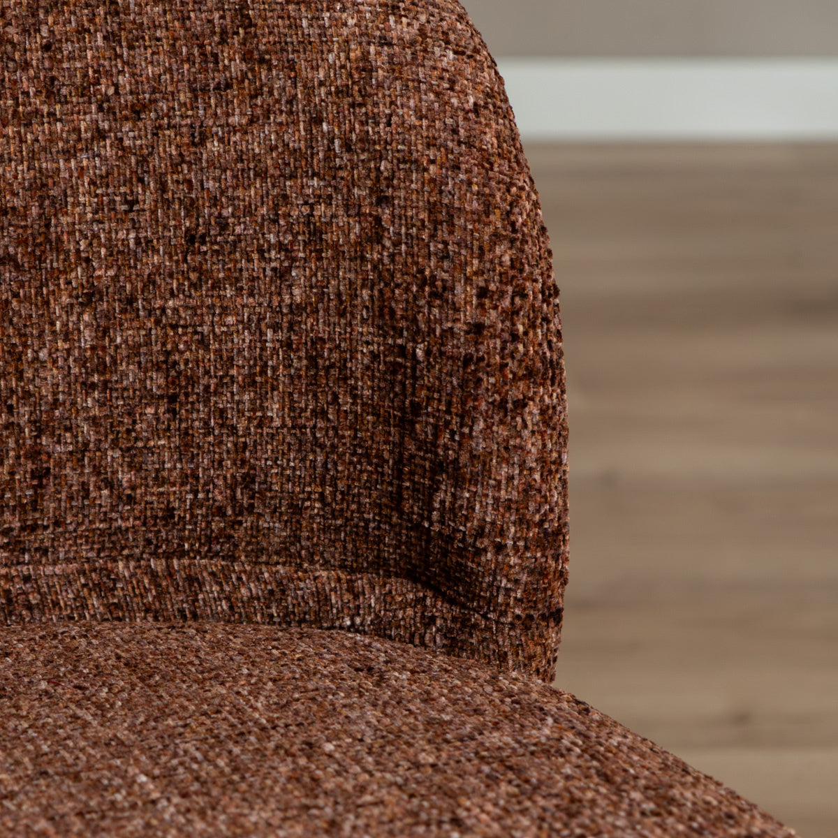 De Charlie is bekleed met een chenille stof, een hoogwaardige grof geweven meubelstof die kracht en comfort perfect combineert. De robuuste structuur voelt zacht en fluweelachtig aan, terwijl subtiele kleurschakeringen in de koperkleur zorgen voor een levendig en eigentijds karakter. Dankzij de water- en vuilafstotende eigenschappen blijft de barkruk niet alleen mooi, maar ook praktisch in gebruik: ideaal voor lange avonden aan de bar, gezellige borrels of zelfs intensief zakelijk gebruik.