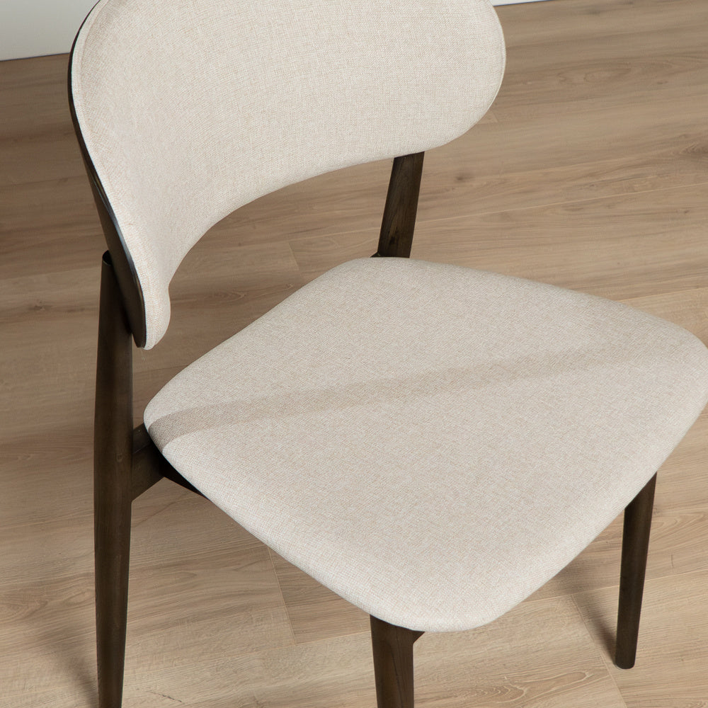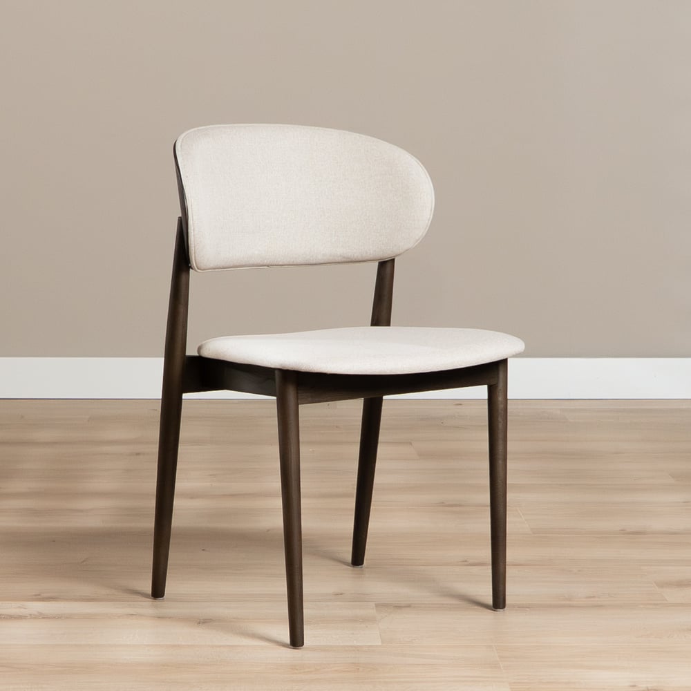 Maak kennis met Eetkamerstoel Bohdi, een verfijnde mix van modern design, zachte lijnen en praktische details. De rugleuning is aan de achterkant van hout en de voorkant gestoffeerd met de linnenstof.