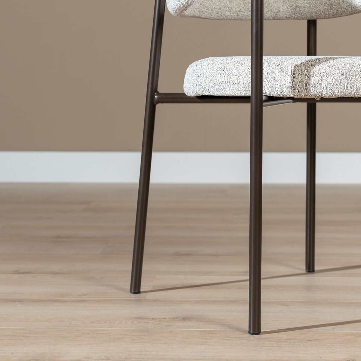De eetkamerstoel is bekleed met een gemêleerde stof die bestaat uit 100% polyester. De stof is waterafstotend en dus makkelijk schoon te maken. Het unieke aan de Gio stoel is het design en het frame met een donkerbruine coating, die de stoel een eyecatcher maken.