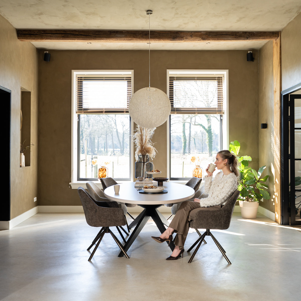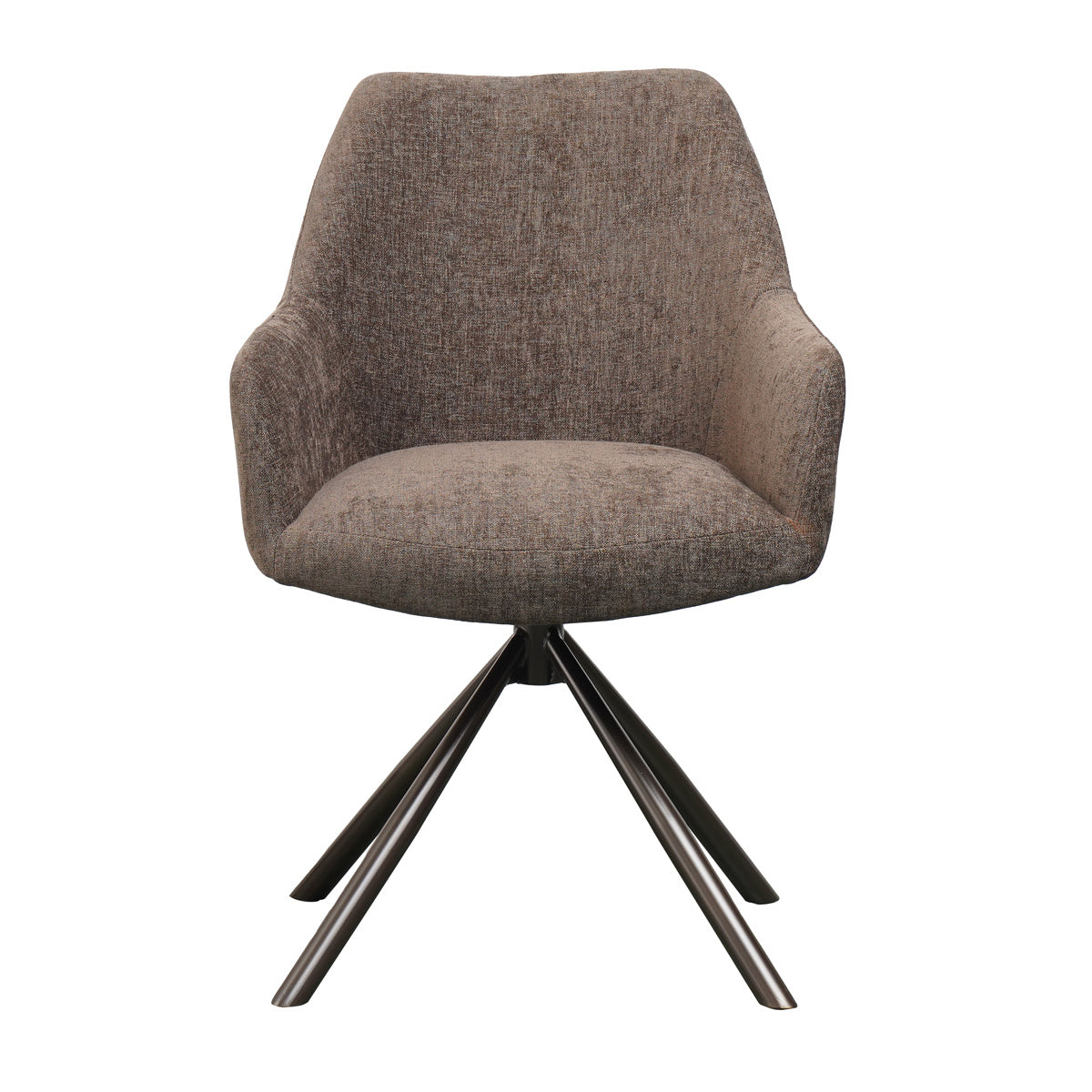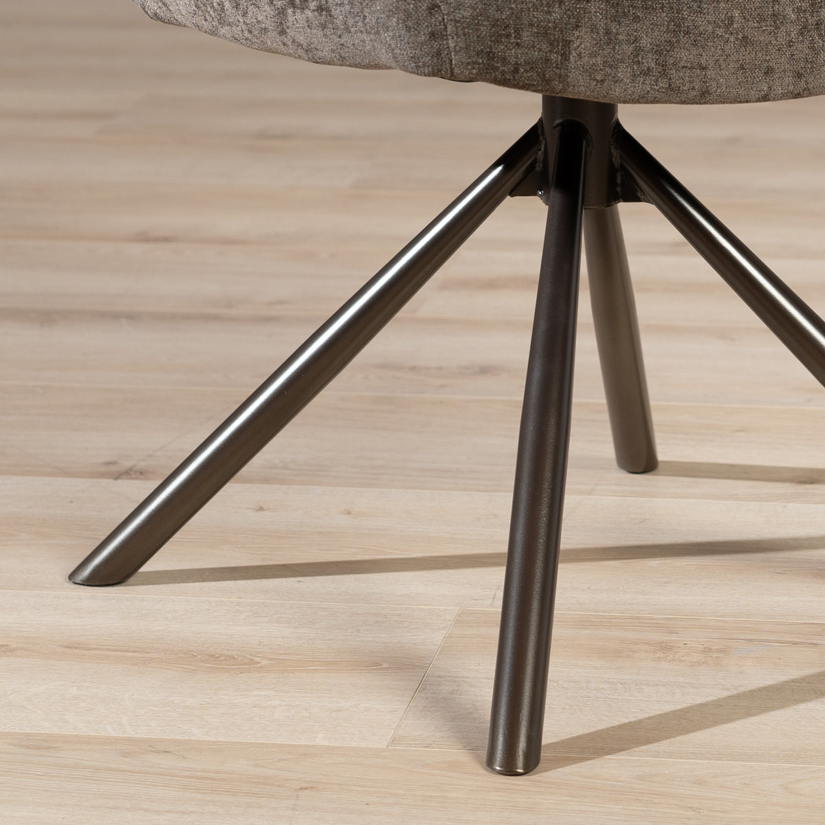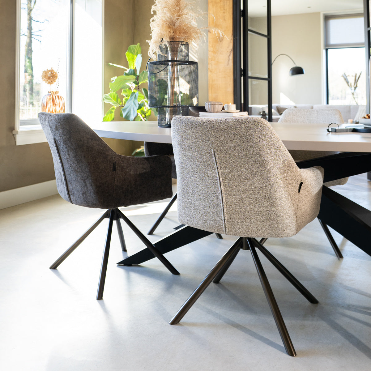Eetkamerstoel Kay is de perfecte eetkamerstoel om heerlijk uren aan te tafelen omdat je bent verzekerd van een goed zitcomfort. Door het donkerbruine stalen frame met glanzende finish in combinatie met de zachte velvet stof heeft de stoel een exclusieve, stijlvolle uitstraling die past binnen de trendy Urban Loft stijl. De combinatie van de velvet stof met subtiele glans en het donkerbruine frame maakt de stoel een echt statement aan de eettafel. Het onderstel is 180 graden draaibaar en door de auto-return functie komen de stoelen altijd automatisch weer netjes recht aan de tafel te staan.