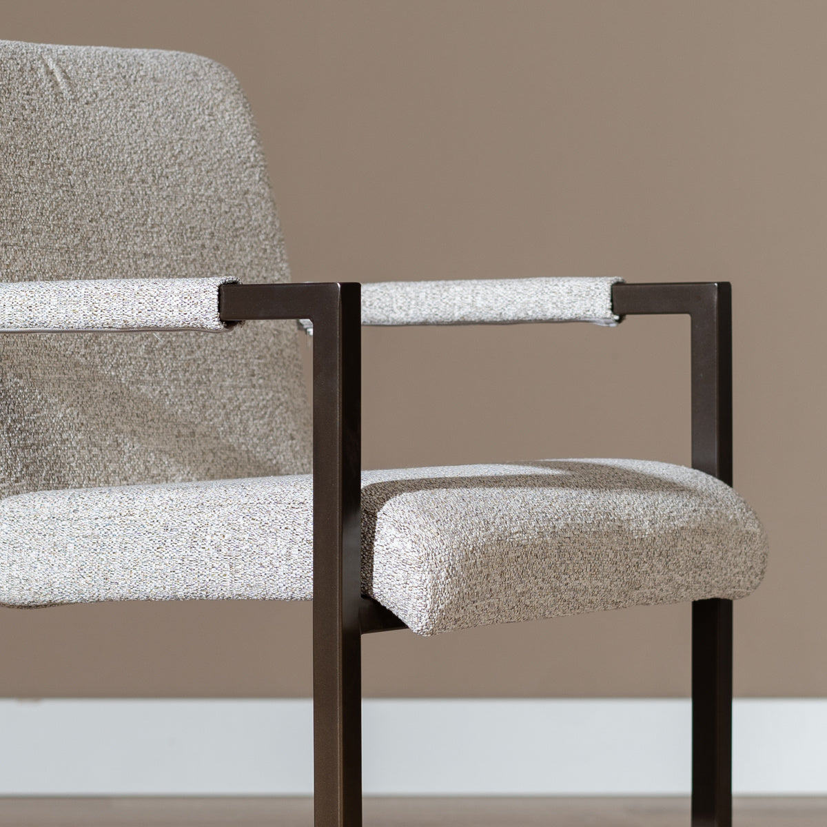 Eetkamerstoel Lio is de perfecte stoel om heerlijk uren aan te tafelen omdat je bent verzekerd van een goed zitcomfort. Door het donkerbruine stalen frame met glanzende finish in combinatie met de gemêleerde stof heeft de stoel een exclusieve, stijlvolle uitstraling die past binnen de trendy Urban Loft stijl. De stoel heeft een industrieel karakter, maar de combinatie van de luxe stof en het donkerbruine frame maakt de stoel een echt statement aan de eettafel.
