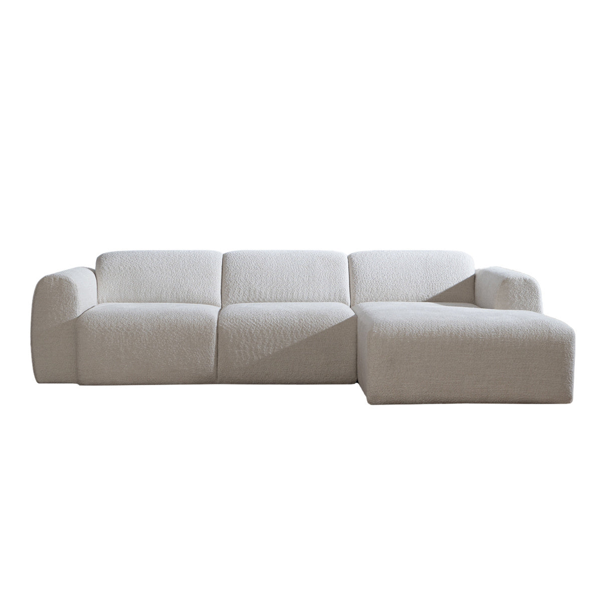 Hoekbank Maine is de perfecte balans tussen stijl en comfort, gemaakt van een fraaie bouclé stof. Dankzij het veelzijdige ontwerp past de Maine moeiteloos in verschillende interieurs.
