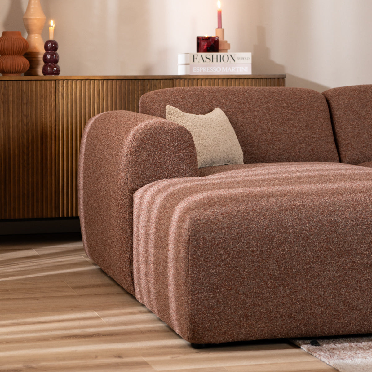 Hoekbank Maine is de perfecte balans tussen stijl en comfort, gemaakt van een fraaie bouclé stof. Dankzij het veelzijdige ontwerp past de Maine moeiteloos in verschillende interieurs.