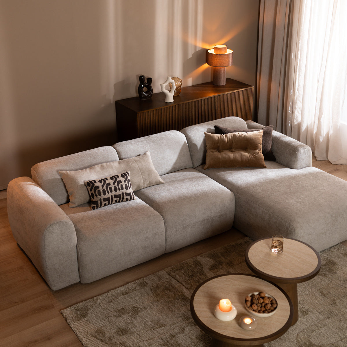 Hoekbank Maine is de perfecte balans tussen stijl en comfort, gemaakt van een fraaie gemêleerde stof. Dankzij het veelzijdige ontwerp past de Maine moeiteloos in verschillende interieurs.