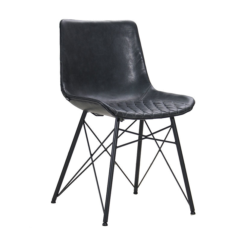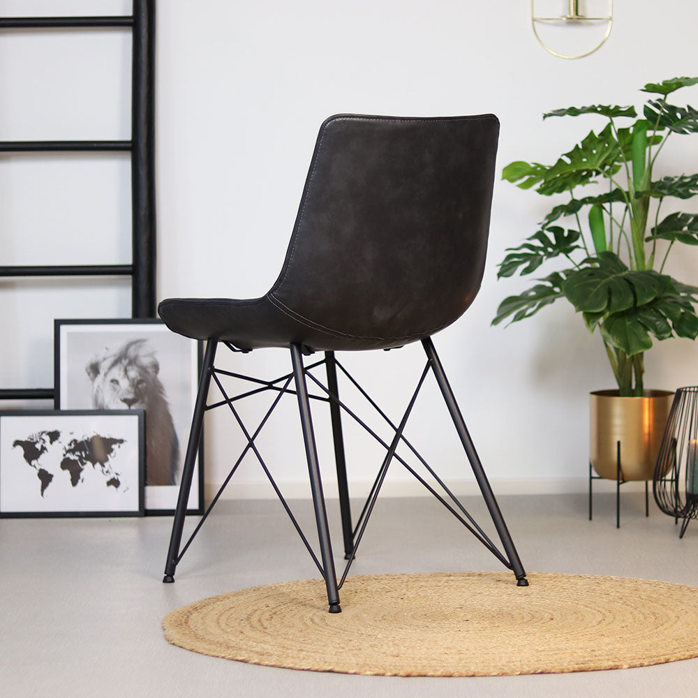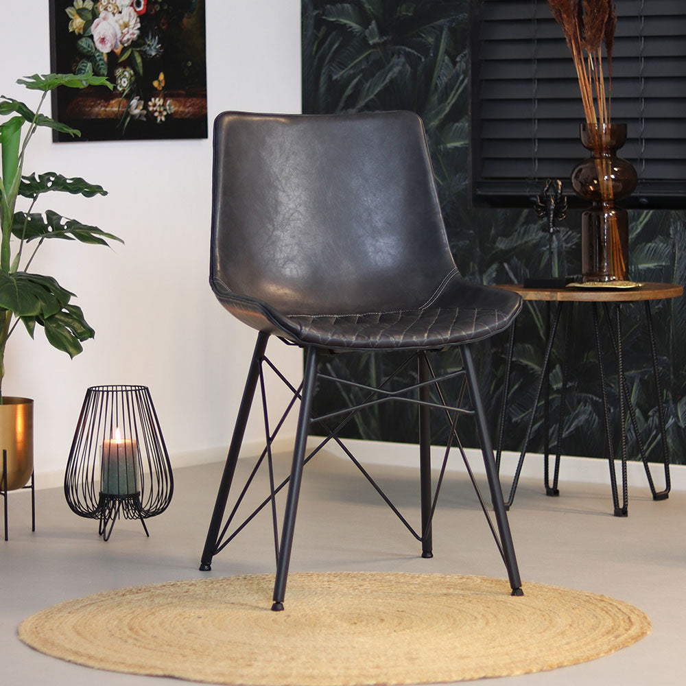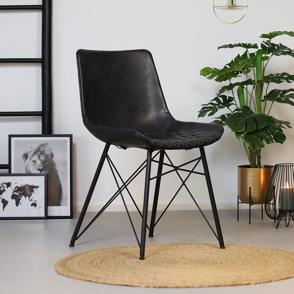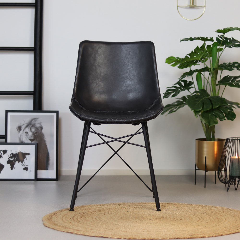 De zitting van eetkamerstoel Lauren is gemaakt van PU leer. Daarnaast is de zitting afgewerkt met een opvallend ruit stiksel. Het onderstel is gemaakt van zwart gepoedercoat metaal en is voorzien van een opvallende kruispoot, wat deze eetkamerstoel een prachtige verschijning maakt! De zitting in combinatie met het stoere metalen frame zorgt voor een robuuste en vintage uitstraling. Perfect voor een industrieel interieur!