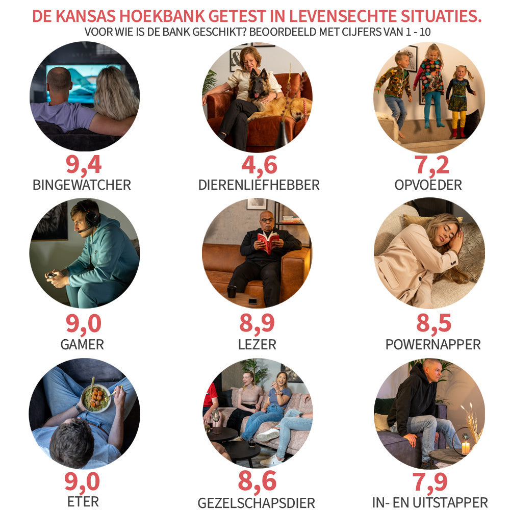 De Kansas hoekbank heeft een hoog zitcomfort. Dit komt door de zachte met schuim gevulde kussens. Omdat de kussens vast zitten aan de bank, bieden deze ook goede ondersteuning in de rug en zakken niet te ver in. De combinatie van nosag vering en HR koudschuim maakt de Kansas bank geschikt voor intensief gebruik. Zo kun je jarenlang genieten van blijvend zitcomfort.