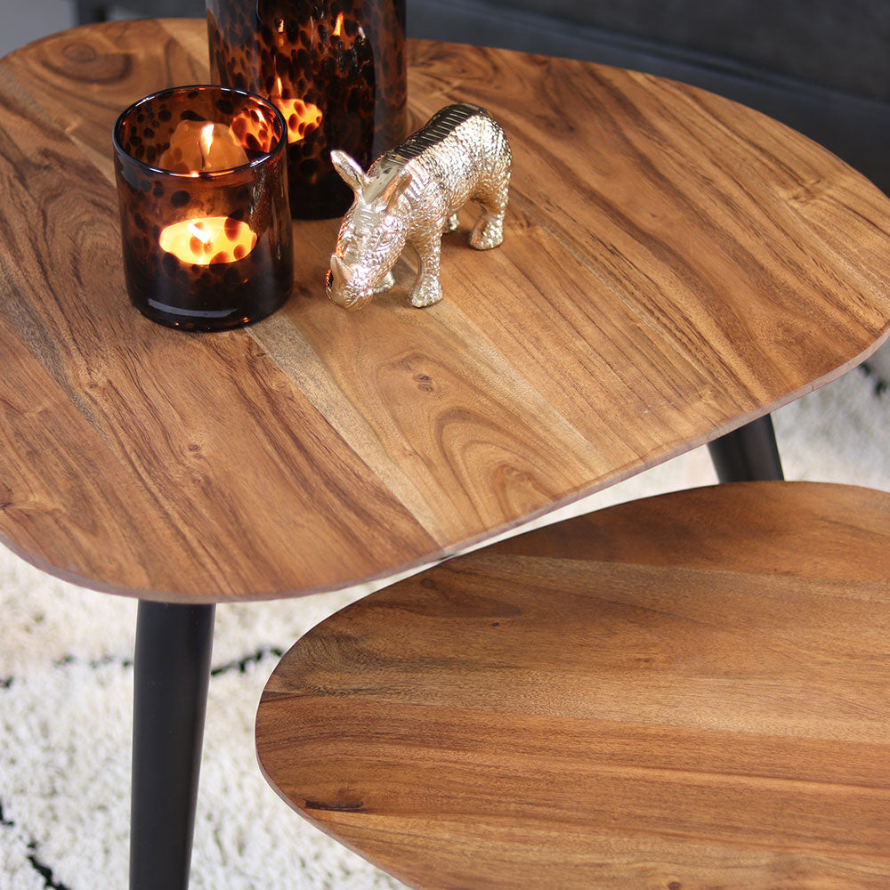 Industriële salontafel set Robinia is gemaakt van acaciahout. Acaciahout staat bekend om zijn warme ondertonen, waardoor het perfect past in verschillende interieurstijlen. Beide tafels hebben drie zwarte gepoedercoate metalen poten als onderstel.