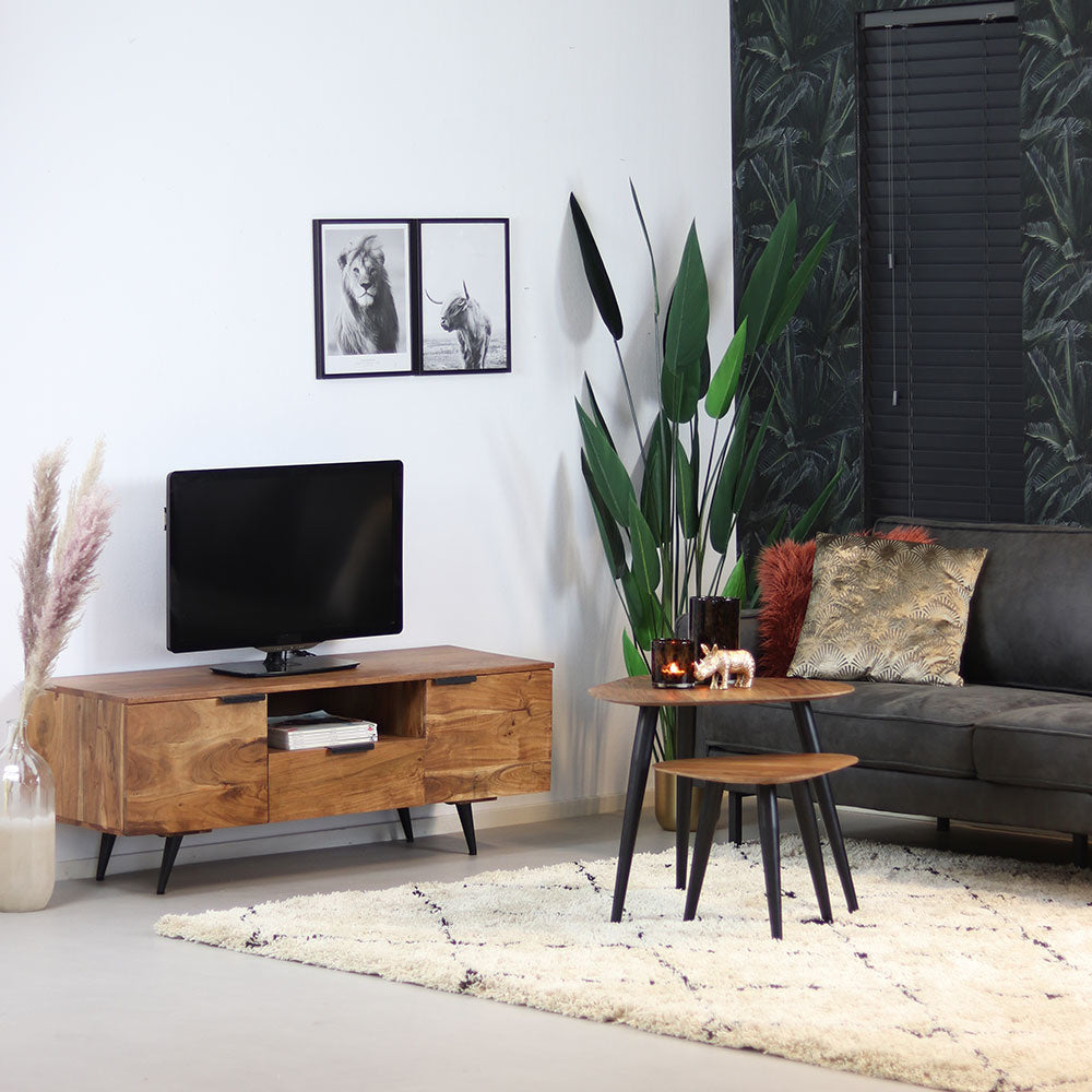 Industriële salontafel set Robinia is een onderdeel van de Robinia serie. Deze collectie bestaat uit een tv meubel, een nachtkastje en een salontafel. Combineer de verschillende meubelen met elkaar voor een mooi geheel!