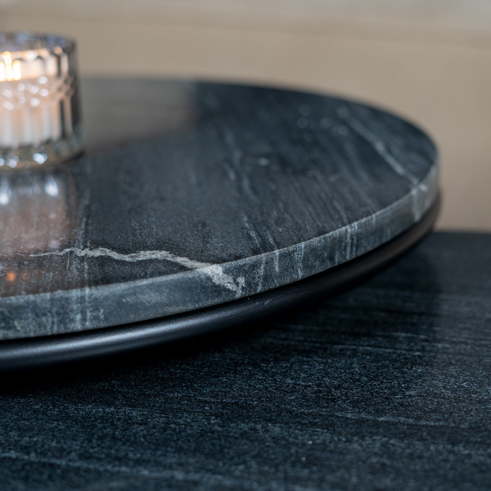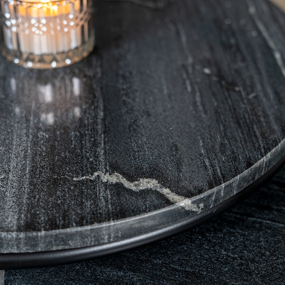 Salontafel set Mia marmer zwart is een set van 2 stuks. De grote salontafel heeft een hoogte van 42 cm en een diameter van 55 cm, de kleine salontafel heeft een hoogte van 34 cm en een diameter van 40 cm. De salontafel set heeft een tafelblad gemaakt van marmer. Marmer kenmerkt zich door kleurschakeringen en aders en heeft een kristalstructuur wat zorgt voor een luxe en chique uitstraling. Marmer is een natuurproduct, waardoor elke salontafel uniek is en zijn eigen kleurschakeringen heeft.