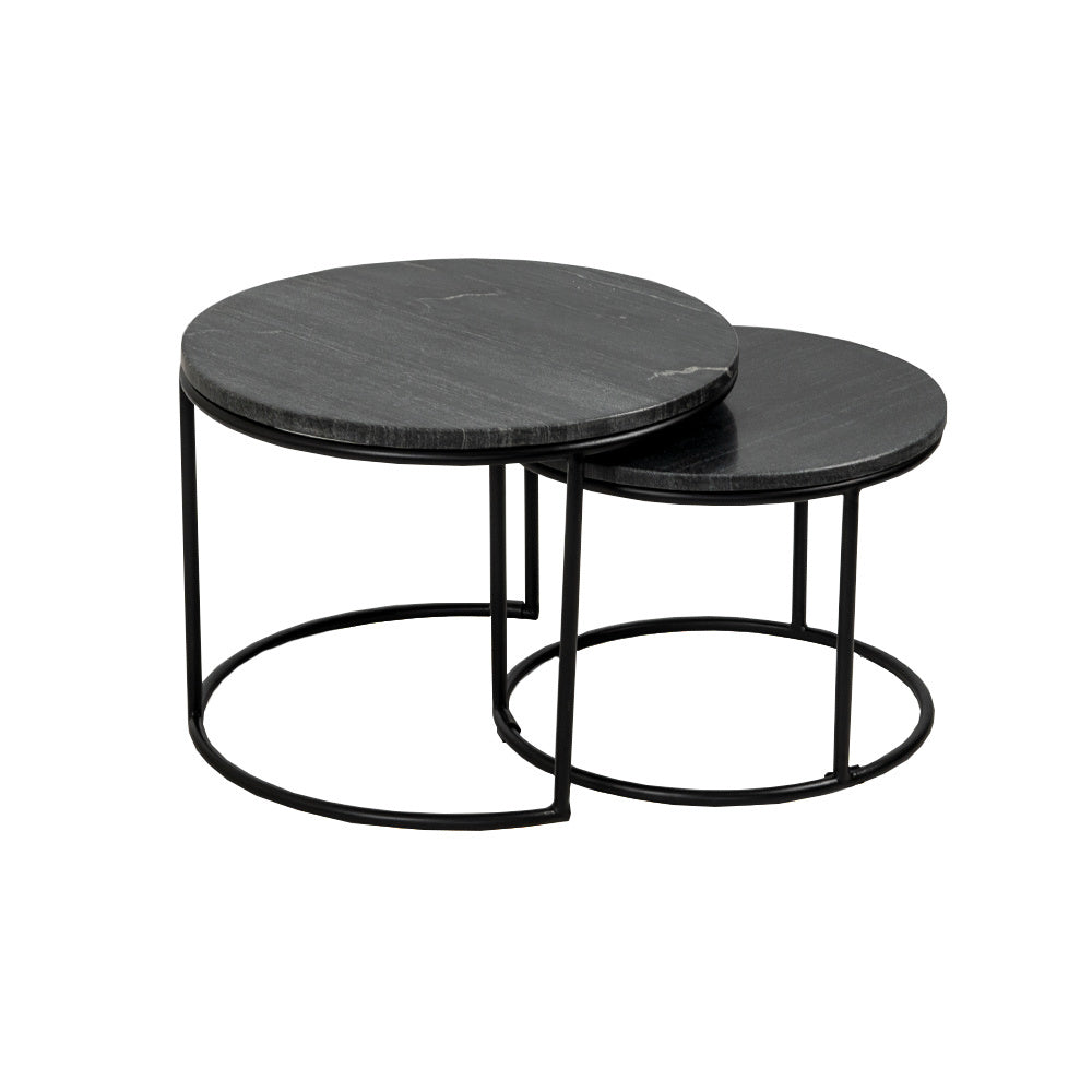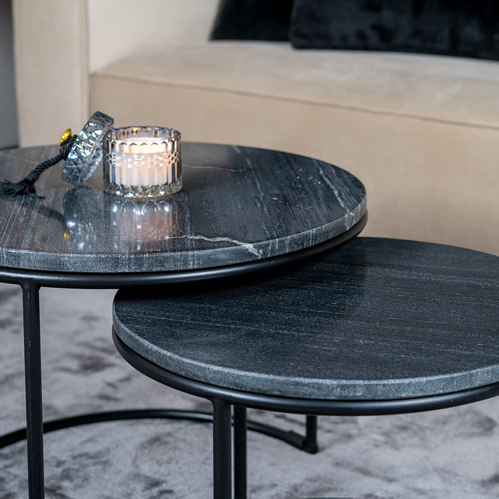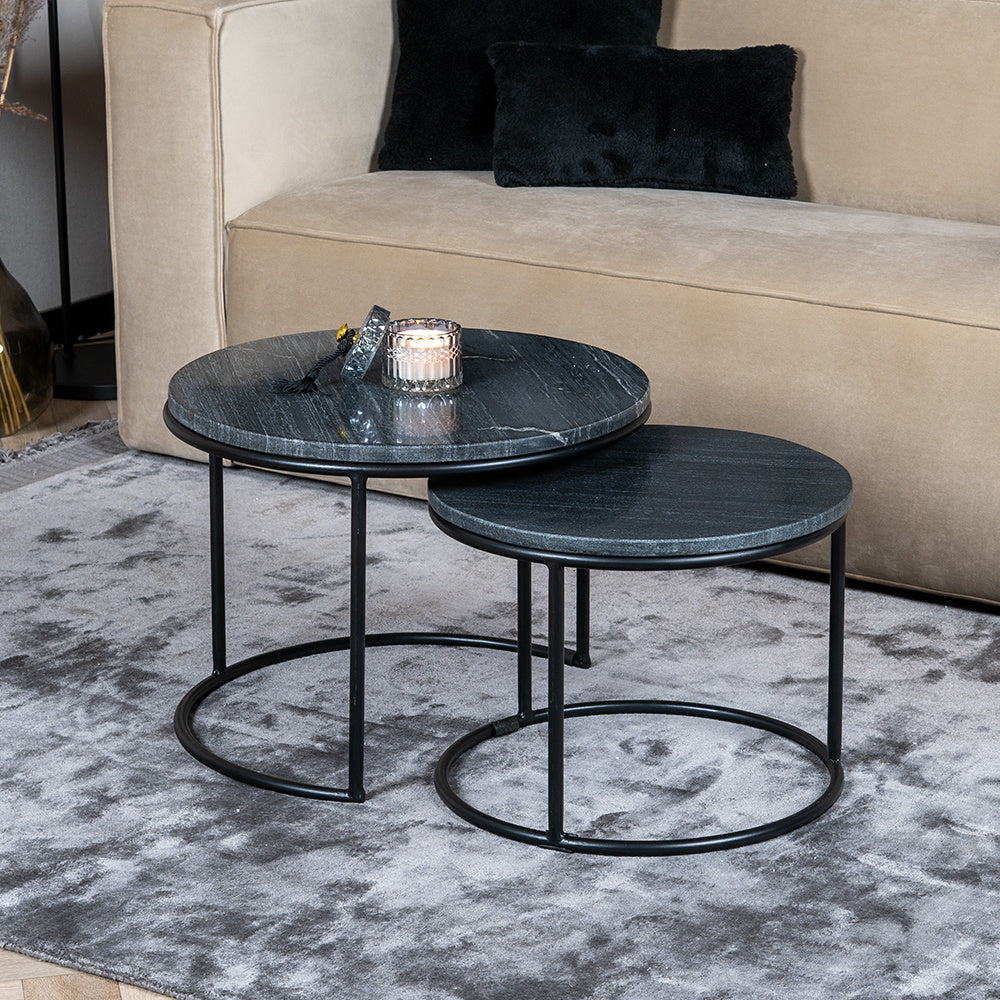 Salontafel set Mia marmer zwart (2 stuks) is een moderne salontafel set met een chique uitstraling. Deze set bestaat uit 2 tafeltjes met verschillende hoogtes waardoor ze onder elkaar geschoven kunnen worden. De tafels hebben een marmeren tafelblad. Hierdoor krijgt het interieur een luxueuze uitstraling! De combinatie met de strakke zwart metalen poten maakt het een moderne tafel set met een chique uitstraling. Het marmeren tafelblad heeft een zwarte kleur met witte aders. De zwarte marmeren salontafel set is goed te combineren met een stoer en industrieel interieur en komt daar echt tot zijn recht.