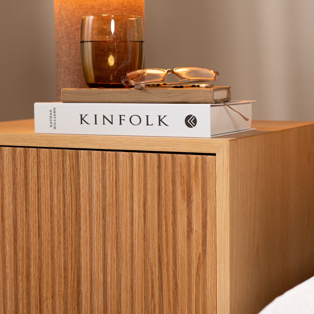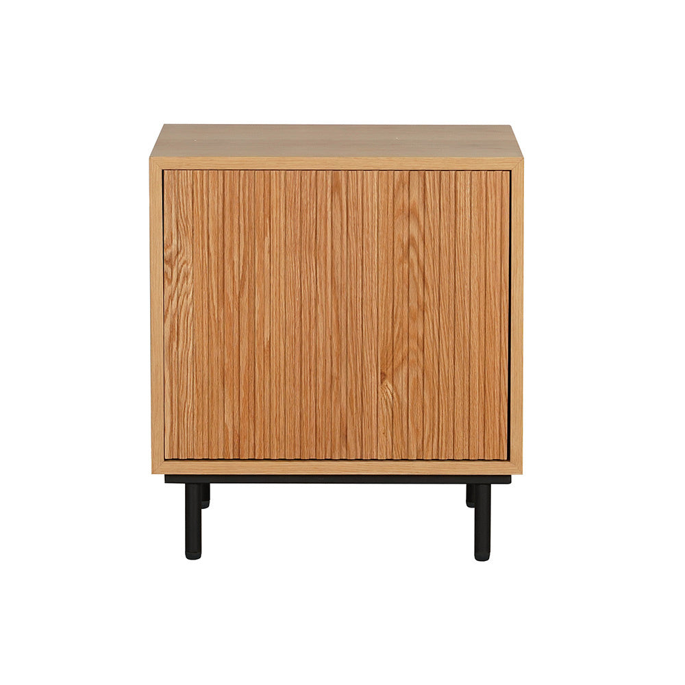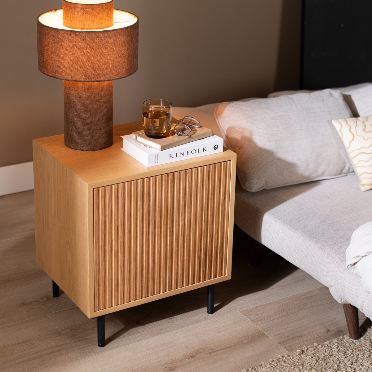 Het front van de kastdeur heeft een gestreept design, waardoor het nachtkastje een elegante uitstraling heeft. Het geribbelde design heeft dezelfde look als die van een houten wandpaneel en het meubel is daardoor ook perfect te matchen met deze interieurtrend. Ook is het kastdeurtje voorzien van een touch to open systeem, waardoor er geen handgrepen nodig zijn.